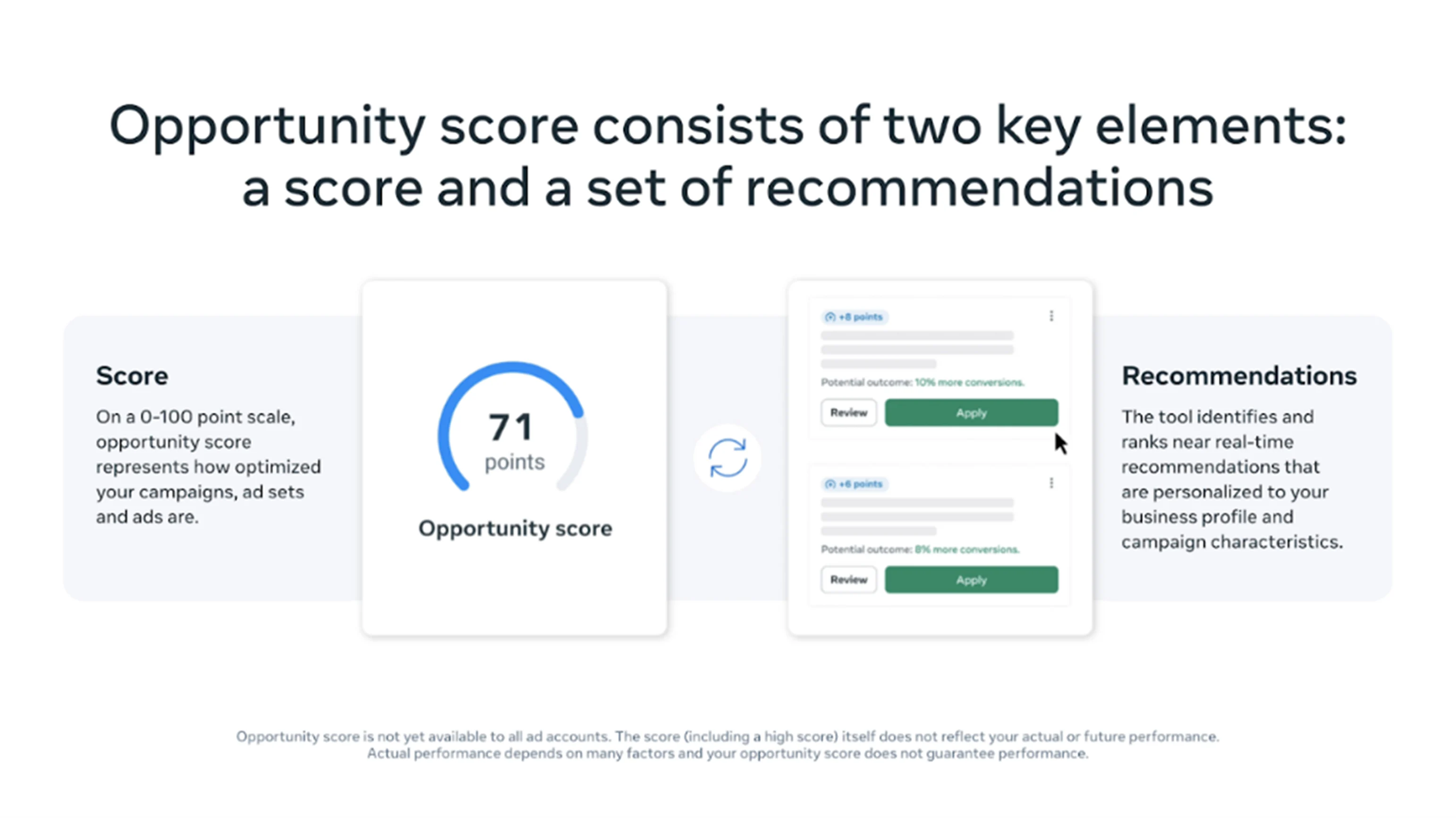 เครื่องมือปรับประสิทธิภาพแคมเปญล่าสุดจาก Meta ที่ชื่อว่า ‘คะแนนโอกาส’ เป็นเครื่องมือที่ให้คำแนะนำเพื่อปรับปรุงประสิทธิภาพแคมเปญในแบบเรียลไทม์ โดยอิงจากอัลกอริทึมของแมชชีนเลิร์นนิ่งขั้นสูงและการทดสอบกับผู้ลงโฆษณาหลายพันราย โดยผู้ใช้งานกลุ่มแรกพบว่าค่าผลลัพธ์เฉลี่ยต่อการกระทำลดลงถึง 12%