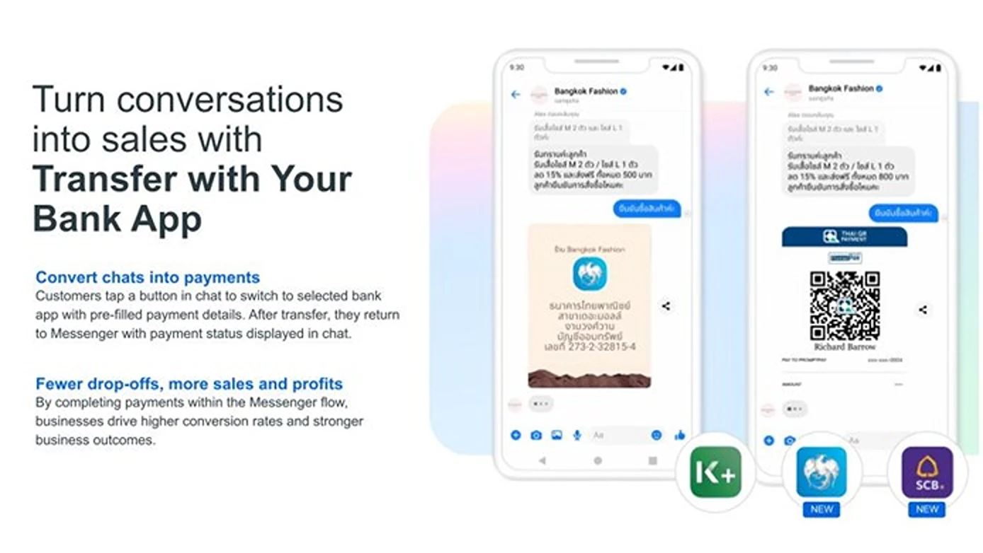 ในปัจจุบัน มีฟีเจอร์ “โอนผ่านแอปธนาคารของคุณ” (Transfer with Your Payment App) ที่พร้อมให้บริการโอนเงินแก่ลูกค้าในประเทศไทยขณะใช้งาน Messenger ได้แล้ว โดยรองรับแอปธนาคารยอดนิยม เช่น K Plus, Krungthai Next, SCB Easy และจะมีพันธมิตรธนาคารเพิ่มขึ้นอีกในอนาคต โดยจะทำให้ประสบการณ์การซื้อขายระหว่างธุรกิจและลูกค้าบน Messenger เป็นไปได้อย่างราบรื่น ไร้รอยต่อ และมีระบบการชำระเงินอัตโนมัติที่รองรับ ช่วยลดอัตราลูกค้าที่ออกจากกระบวนการซื้อก่อนทำรายการสำเร็จ รวมถึงเพิ่มระดับความพึงพอใจ และอัตราการซื้อสำเร็จด้วยเพียงไม่กี่คลิก