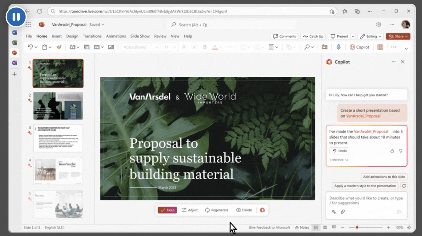 ในเดโม่เผยให้เห็นความสามารถในการดึงข้อมูลจากเอกสารอื่น มาสร้างเป็นพรีเซนเทชั่นใน PowerPoint ได้ภายในคำสั่งหรือ Prompt เดียว โดยที่ผู้ใช้งานสามารถเลือกได้ว่าอยากให้พรีเซนเทชั่นออกมาในธีมไหน สีแบบไหน