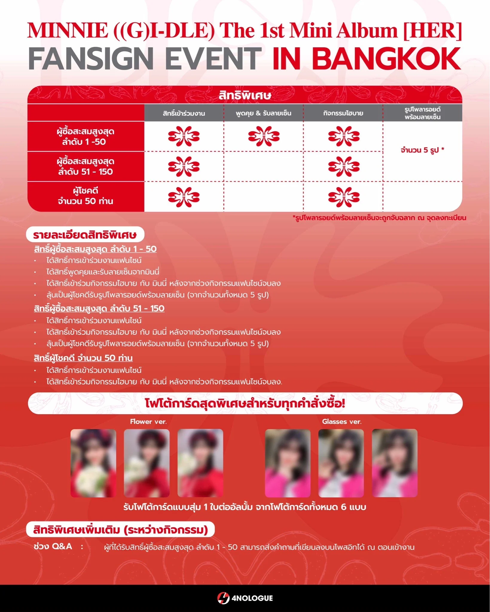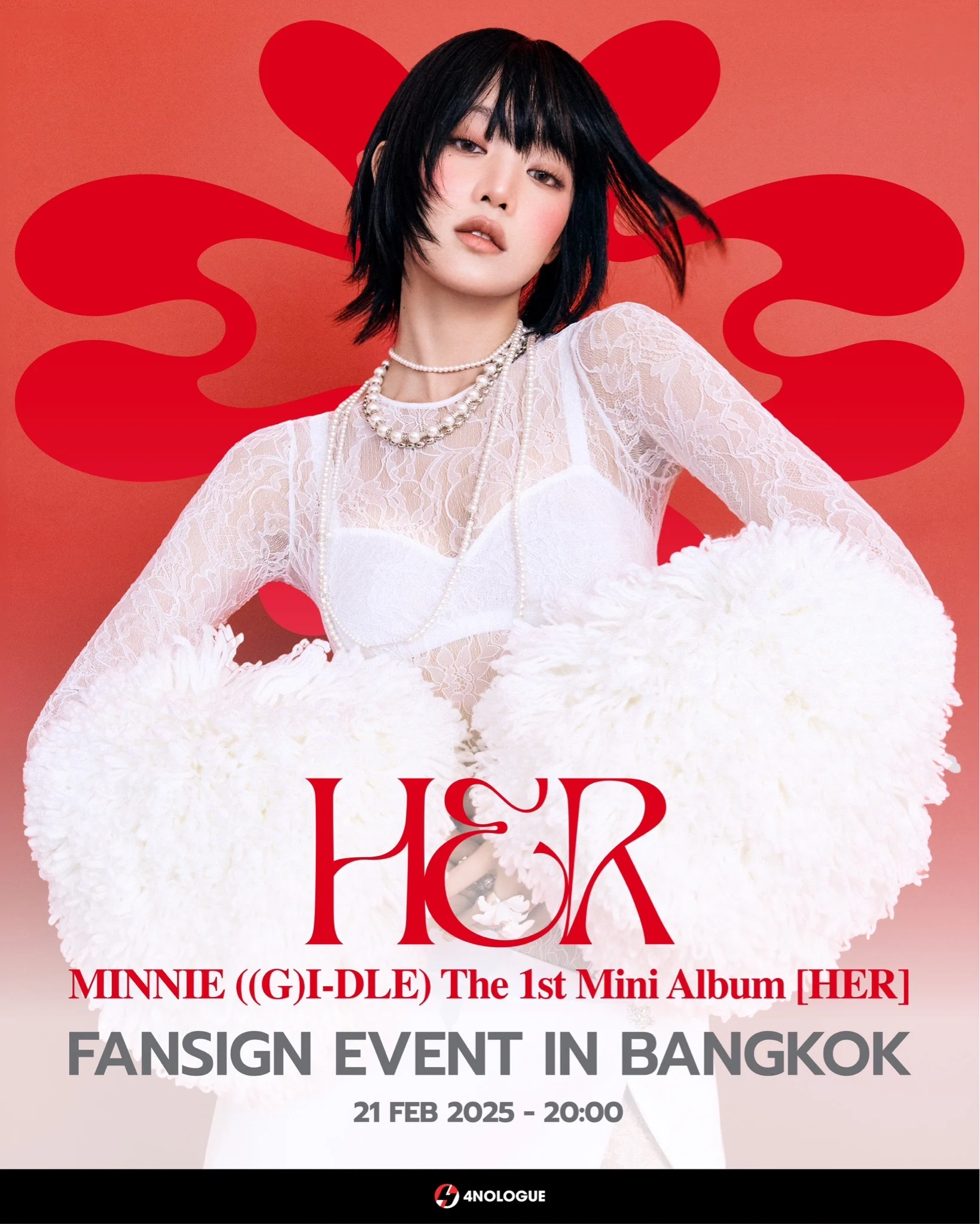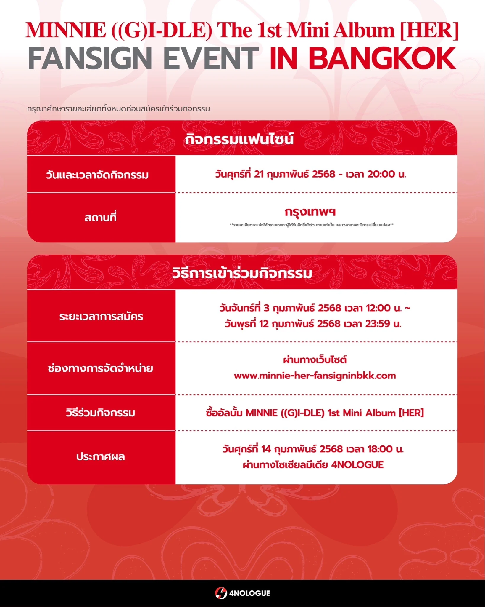 แฟนคลับชาวไทยกรี๊ดหนักแน่นอน เมื่อ มินนี่ (G)I-DLE จัดงานภายใต้ชื่อ “MINNIE (G)I-DLE The 1st Mini Album [HER] FANSIGN EVENT IN BANGKOK ” เป็นงานแฟนไซน์ครั้งแรกในประเทศไทยโดยมี CUBE ENTERTAINMENT และ COPAN GLOBAL บริษัทชั้นนำจากประเทศเกาหลีใต้ ร่วมกับ4NOLOGUE เพื่อดีไซน์อีเว้นต์แสนพิเศษครั้งนี้มอบให้ประทับใจแฟนคลับมากที่สุด