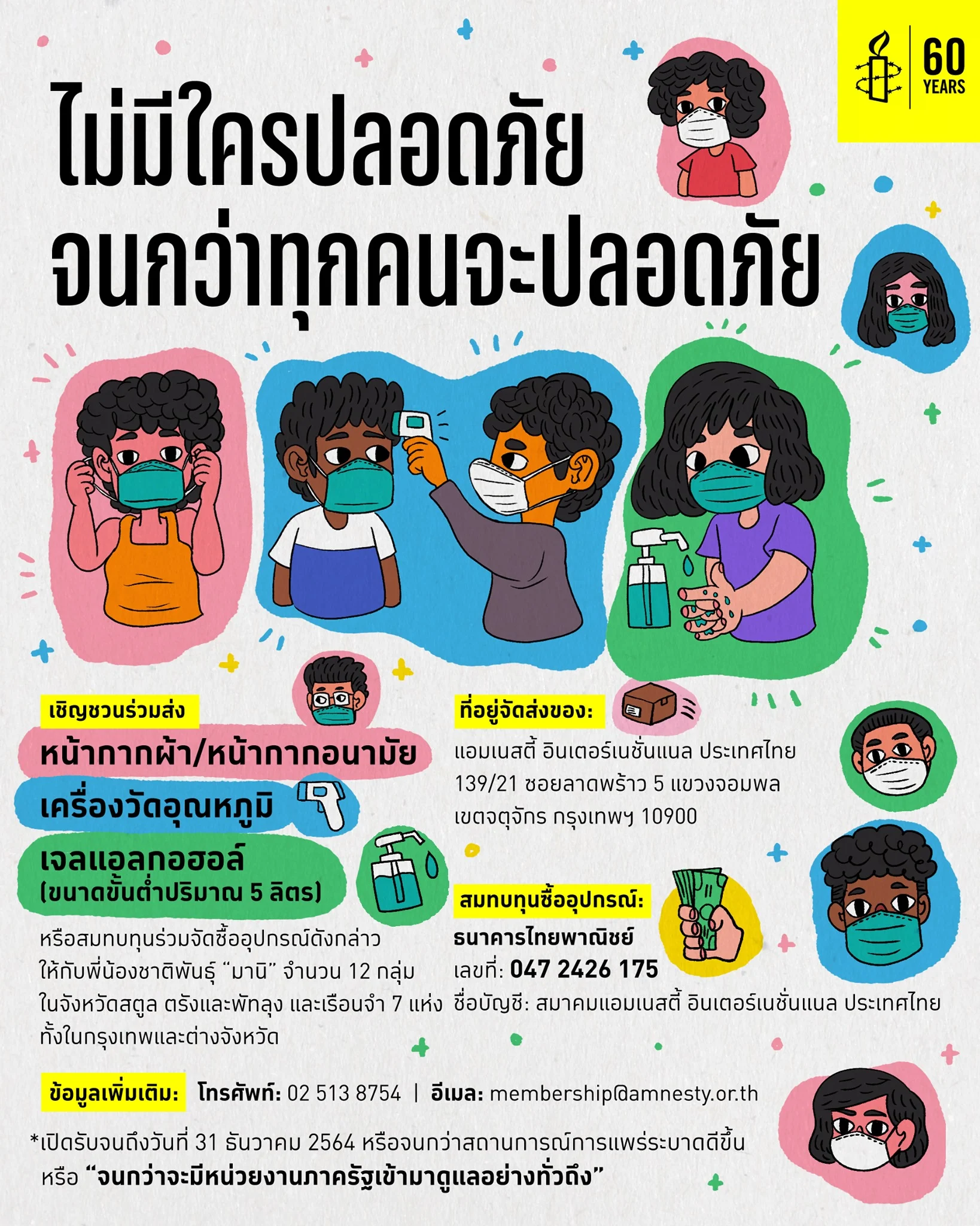 สำหรับโครงการนี้จะเปิดระดมทุนและรับบริจาคเงินและแบ่งปันอุปกรณ์ป้องกันโรคโควิด-19 ตั้งแต่วันนี้ ถึง 31 ธันวาคม 2564 หรือจนกว่าจะมีหน่วยงานภาครัฐเข้ามาดูแลอย่างทั่วถึง ผู้สนใจสามารถจัดส่งอุปกรณ์ป้องกันโควิด-19 มาได้ที่ แอมเนสตี้ อินเตอร์เนชั่นแนล ประเทศไทย 139/21 ซอยลาดพร้าว 5 แขวงจอมพล เขตจตุจักร กรุงเทพฯ 10900 หรือร่วมสมทบทุนซื้ออุปกรณ์ต่างๆ ด้วยการโอนเข้าบัญชีสมาคมแอมเนสตี้ อินเตอร์เนชั่นแนล ประเทศไทย ธนาคารไทยพาณิชย์ เลขที่ 047- 2-42617-5