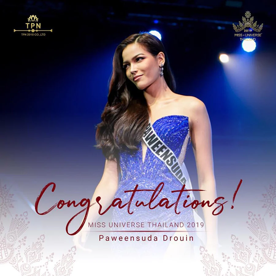 ผลการประกวด Miss Universe Thailand 2019 ปรากฏว่า ฟ้าใส ปวีณสุดา ดรูอิ้น สาวไทยเชื้อสายจีน-แคนาดา ได้ตำแหน่งไปครอง