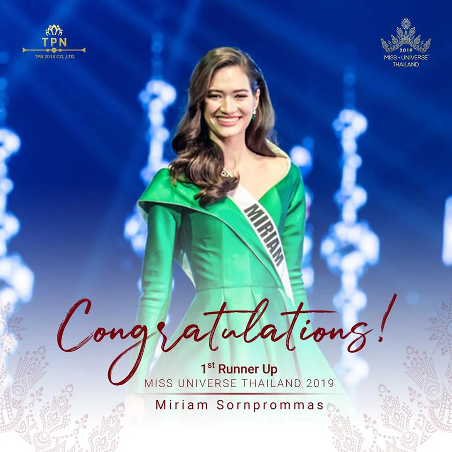 ส่วนรองอันดับ 1 ได้แก่ มิเรียม ศรพรหมมาศ สาวครูครึ่งไทย-อเมริกา อายุ 24 ปี เจ้าของความสูง 185 เซนติเมตร คว้า Golden Tiara Ticket เริ่มชีวิตนางแบบตั้งแต่อายุ 14 ปี มีผลงานทั้งถ่ายแบบและเดินแบบมากมาย