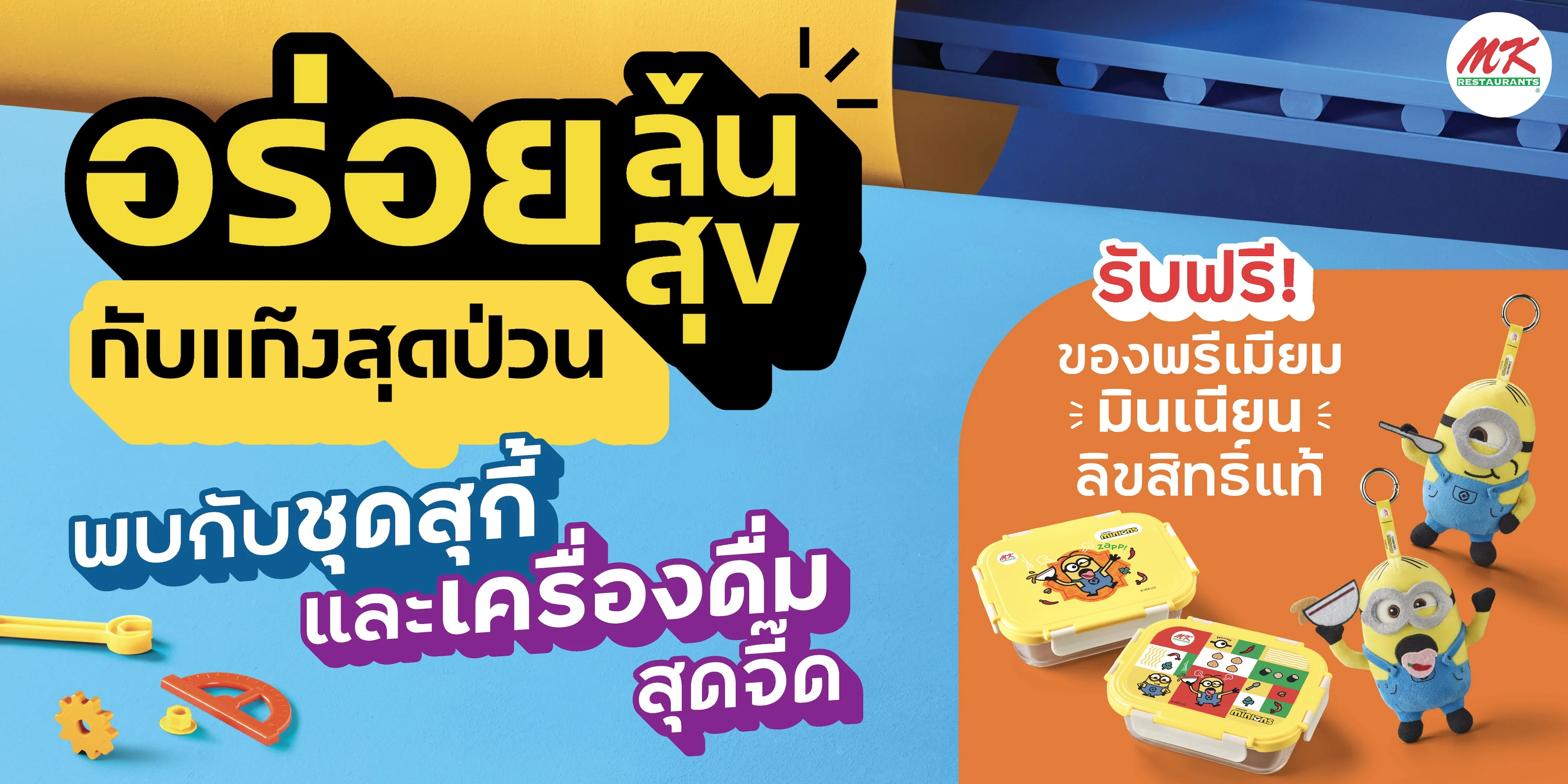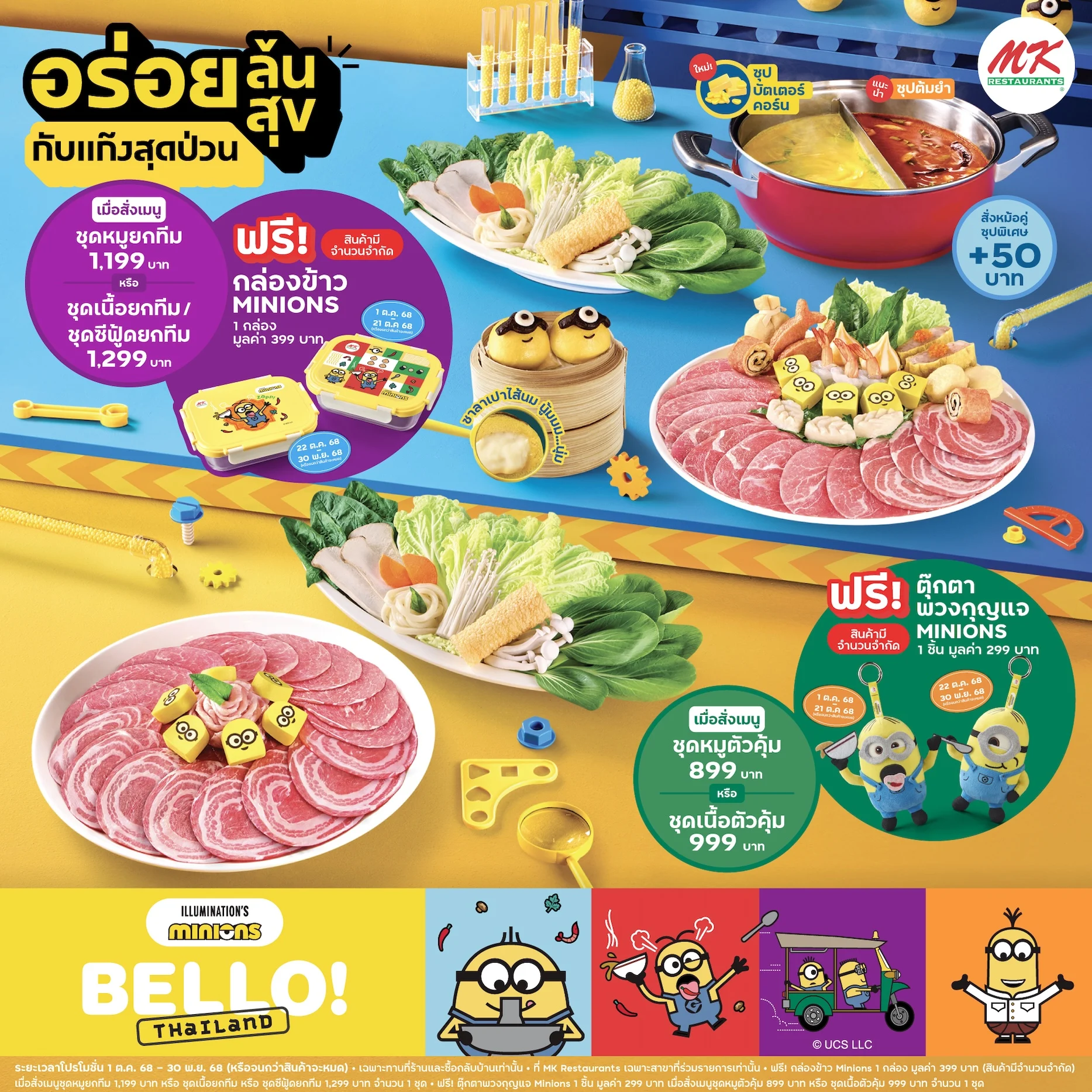 ปฎิบัติการณ์ป่วนทั่วไทย MK Restaurants เสิร์ฟกลยุทธ์ Brand Collaboration กับ ‘มินเนี่ยน’ คาแรกเตอร์ดังระดับโลก ร่วมแคมเปญ “อร่อยล้นสุขกับแก๊งสุดป่วน” ปล่อยเมนูพิเศษให้ทานได้ที่ร้านทั้งสาขาปกติ และสาขาที่ร่วมรายการ โปรโมชั่น คุ้มเกินคุ้ม 299 บาท ทั้งเมนู ลูกชิ้น Minions, ซาลาเปา Minions และเครื่องดื่มสีสันสดใส สร้างประสบการณ์ใหม่ ทั้งยังมีของพรีเมียมคอลเลคชันพิเศษน่าสะสมอีกด้วย