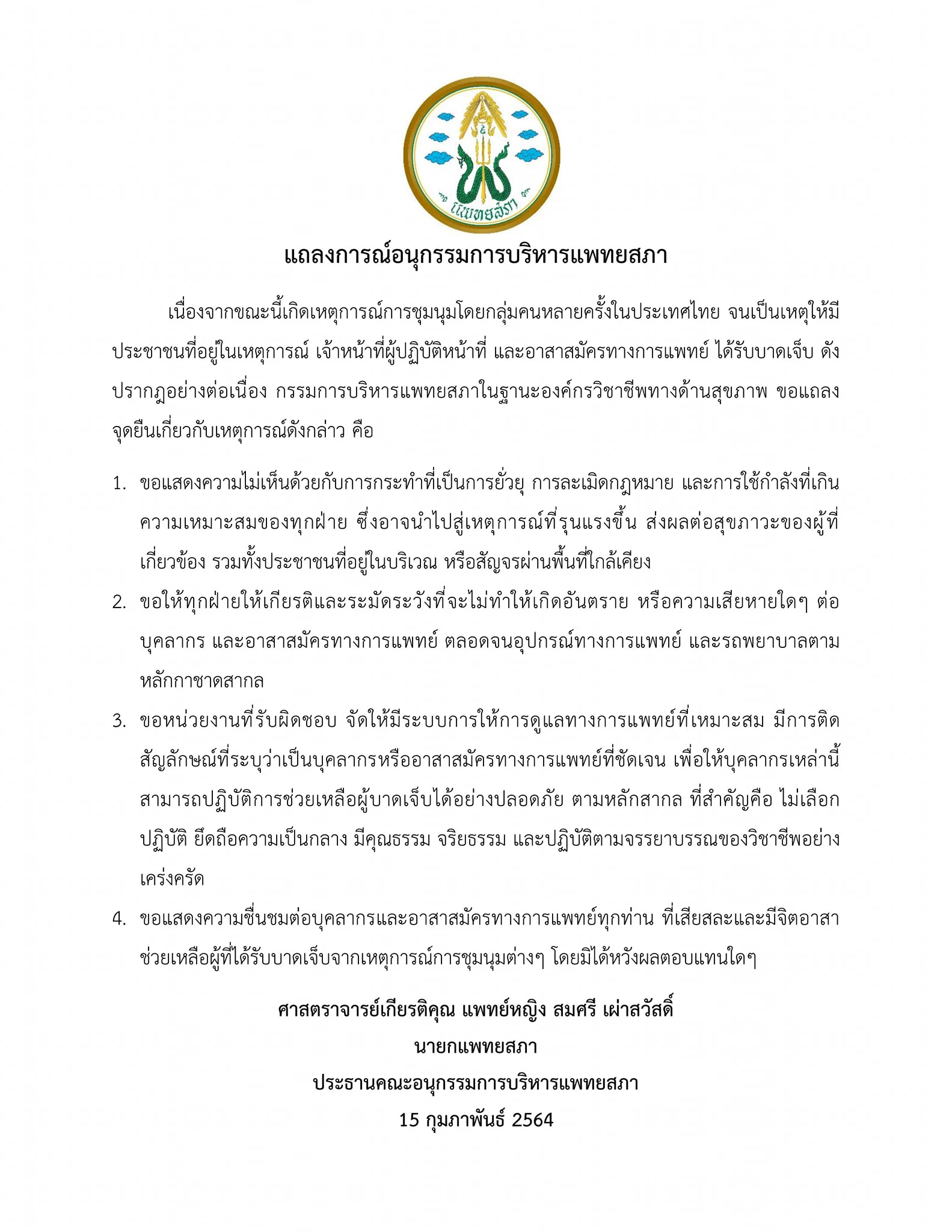 วันที่ 15 ก.พ. 2564 อนุกรรมการบริการแพทยสภา ได้ออกแถลงการณ์ถึงเหตุการณ์ในวันที่ 13 กุมภาพันธ์ ว่า เนื่องจากขณะนี้เกิดเหตุการณ์การชุมนุมโดยกลุ่มคนหลายครั้งในประเทศไทย จนเป็นเหตุให้มีประชาชนที่อยู่ในเหตุการณ์ เจ้าหน้าที่ผู้ปฏิบัติหน้าที่ และอาสาสมัครทางการแพทย์ ได้รับบาดเจ็บ ดังปรากฎอย่างต่อเนื่อง กรรมการบริหารแพทยสภาในฐานะองค์กรวิชาชีพทางด้านสุขภาพ ขอแถลงจุดยืนเกี่ยวกับเหตุการณ์ดังกล่าว คือ