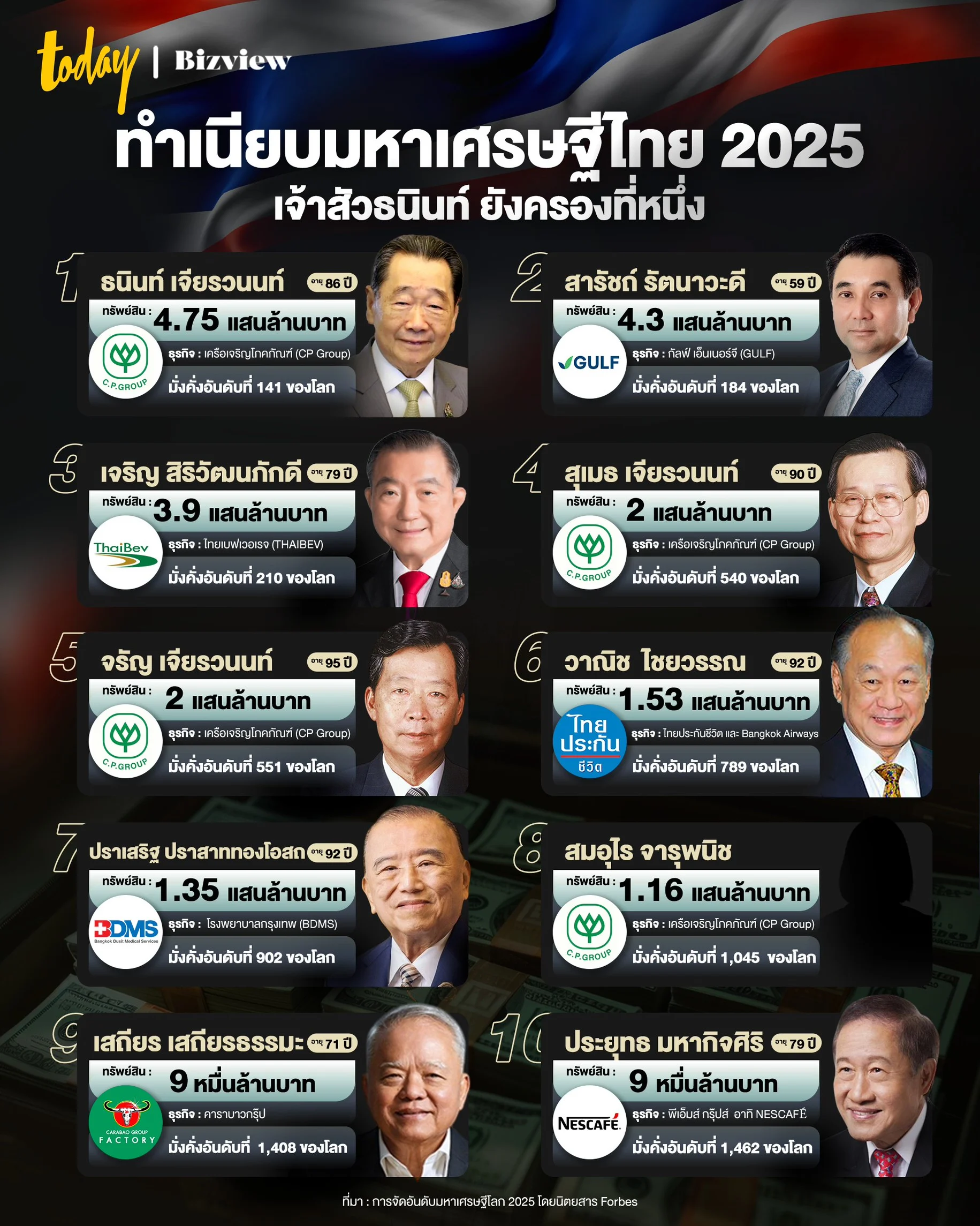 เปิดทำเนียบมหาเศรษฐีไทยปี 2025 ซึ่งเป็นการจัดอันดับโดยนิตยสาร Forbes ซึ่งในปีนี้มีคนไทยติดทำเนียบมหาเศรษฐีโลกรวมกัน 25 คน
