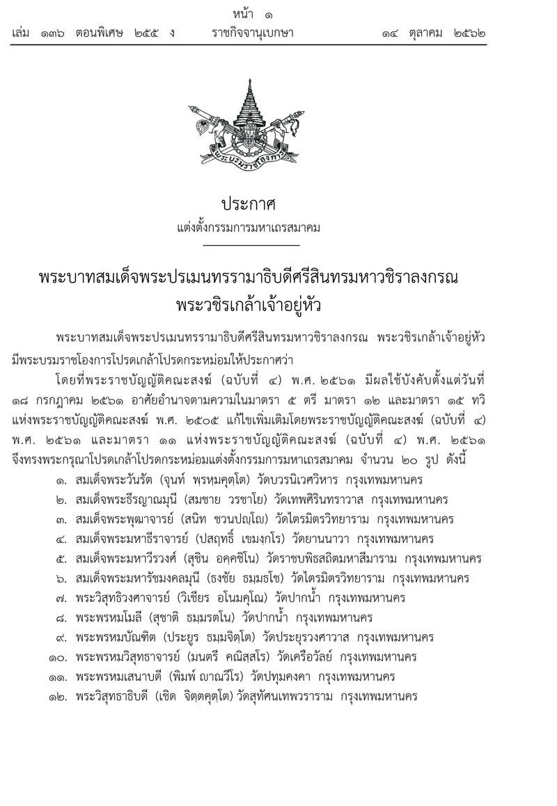 พระบาทสมเด็จพระปรเมนทรรามาธิบดีศรีสินทรมหาวชิราลงกรณ พระวชิรเกล้าเจ้าอยู่หัว มีพระบรมราชโองการโปรดเกล้าโปรดกระหม่อมให้ประกาศว่าโดยที่พระราชบัญญัติคณะสงฆ์ (ฉบับที่ 4) พ.ศ. 2561 มีผลใช้บังคับตั้งแต่วันที่ 18 กรกฎาคม 2561 อาศัยอำนาจตามความในมาตรา 5 ตรี มาตรา 12 และมาตรา 15 ทวิ แห่งพระราชบัญญัติคณะสงฆ์ พ.ศ. 2505 แก้ไขเพิ่มเติมโดยพระราชบัญญัติคณะสงฆ์ (ฉบับที่ 4) พ.ศ. 2561 และมาตรา 11 แห่งพระราชบัญญัติคณะสงฆ์ (ฉบับที่ 4) พ.ศ. 2561 จึงทรงพระกรุณาโปรดเกล้าโปรดกระหม่อมแต่งตั้งกรรมการมหาเถรสมาคม จำนวน 20 รูป ดังนี้