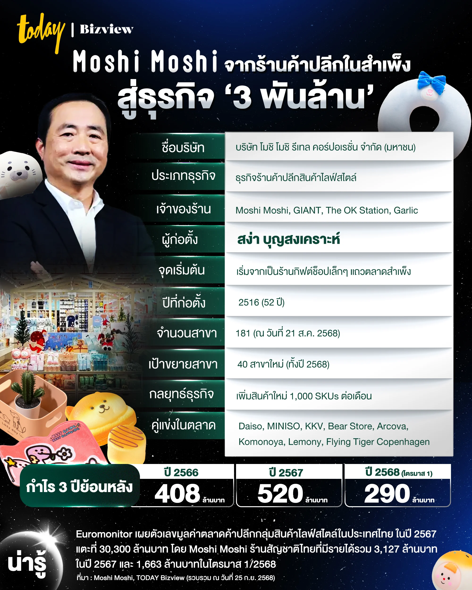 TODAY Bizview ชวนมาดูข้อมูลน่าสนใจเกี่ยวกับแบรนด์นี้ของคนไทย ซึ่งปัจจุบันมีคู่แข่งในตลาดที่เป็นแบรนด์สัญชาติต่างประเทศไม่น้อย แต่ Moshi Moshi ก็ยังเป็นแบรนด์ที่ได้กำไร และมีการเติบโตที่น่าสนใจแบรนด์หนึ่งของคนไทย