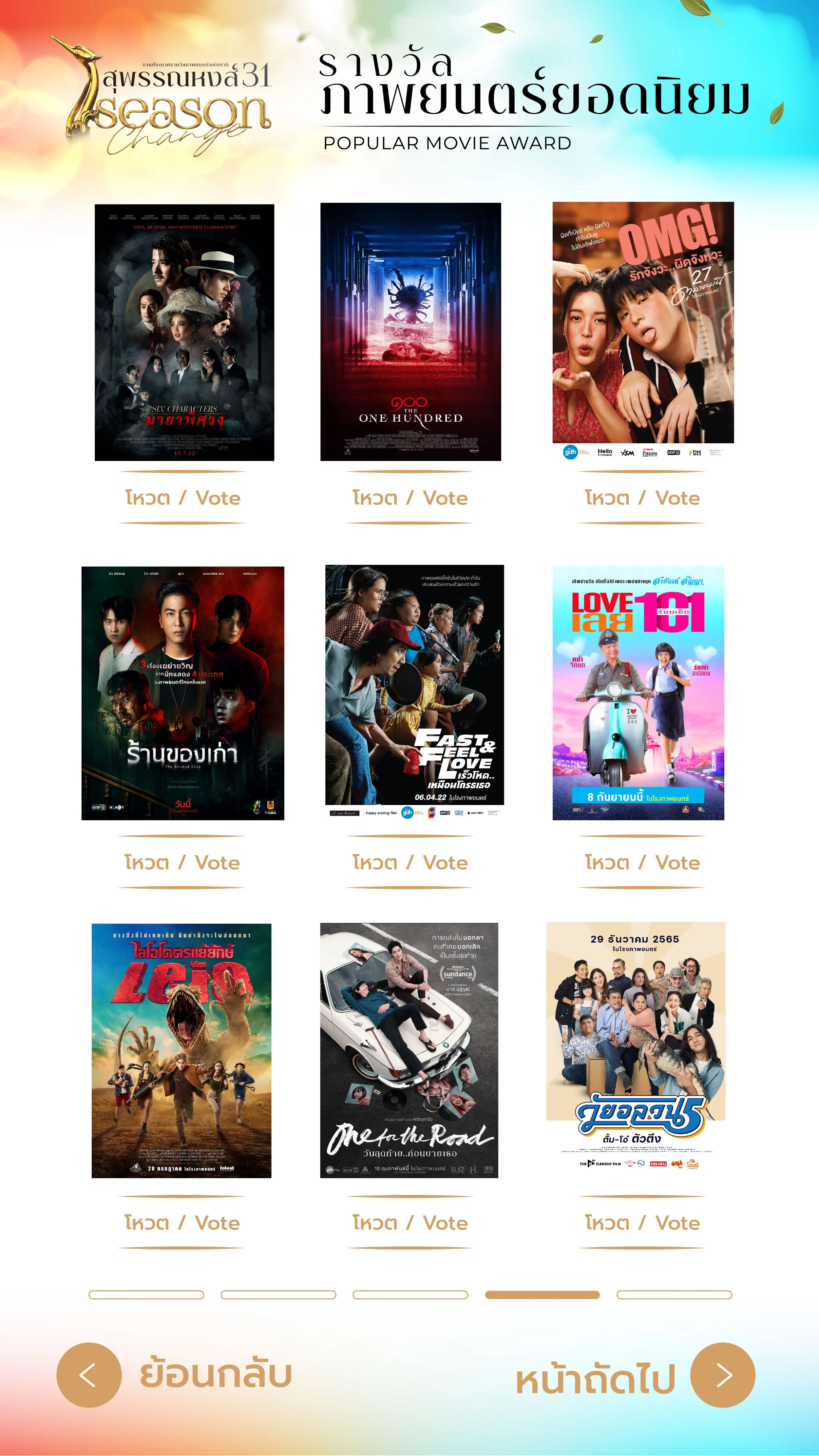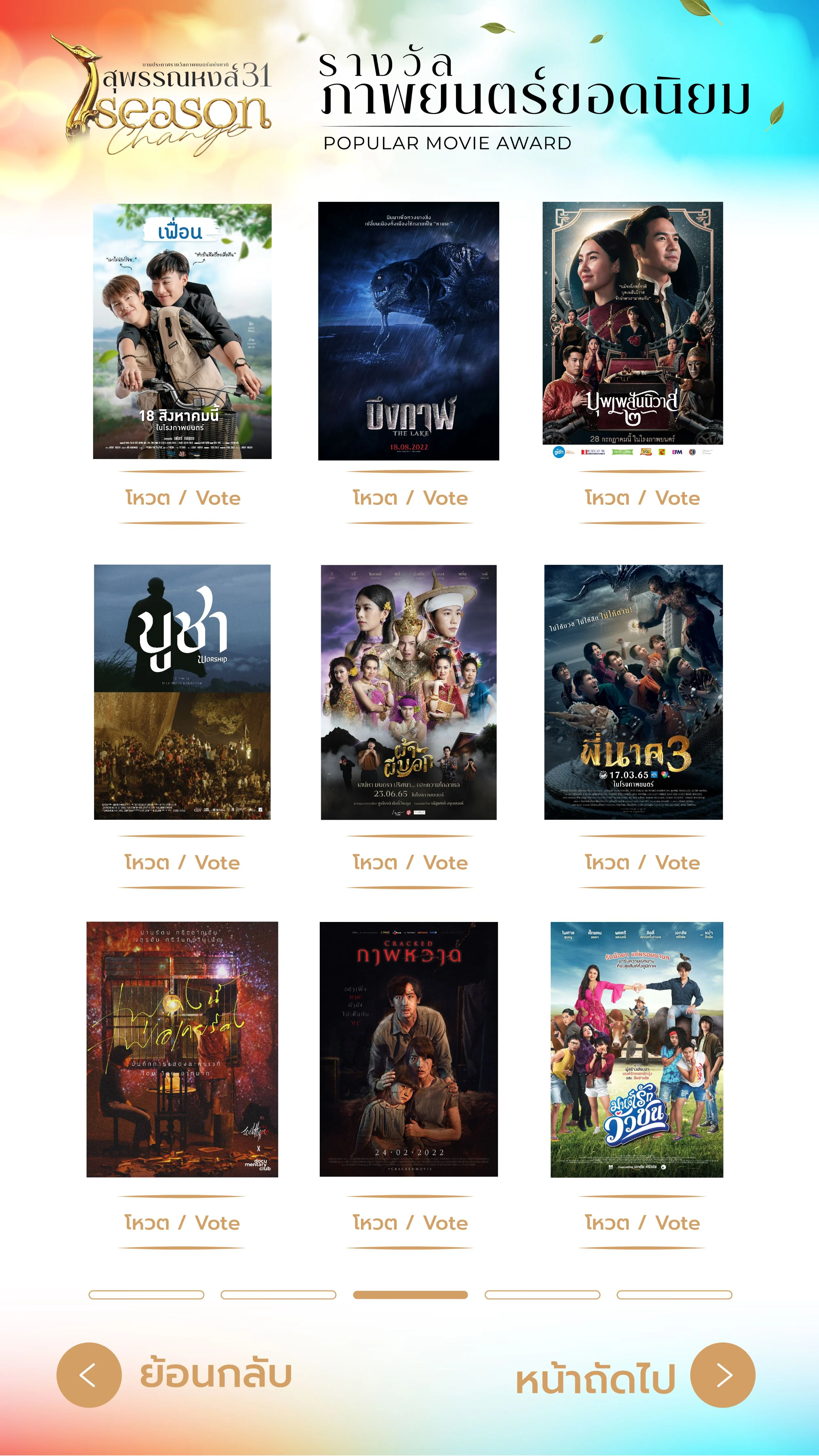 ล่าสุดใน “งานแถลงข่าวงานประกาศรางวัลสุพรรณหงส์ครั้งที่ 31…Season Change” (ซีซั่น เชนจ์) นอกจากทาง สมาพันธ์สมาคมภาพยนตร์แห่งชาติ ร่วมกับ กระทรวงวัฒนธรรม (วธ.) และ บริษัท ทรูโฟร์ยู สเตชั่น จำกัด (ทรูโฟร์ยู ช่อง 24) ได้เปิดโผรายชื่อผู้เข้าชิงรางวัลทั้ง 17 สาขาในงานประกาศรางวัลภาพยนตร์แห่งชาติ “สุพรรณหงส์ครั้งที่ 31 ประจำปี 2565 แล้ว ยังเปิดรายชื่อภาพยนตร์ 45 เรื่องที่ลงสนามเข้าชิงคะแนนโหวตจากผู้ชมในรางวัล “Most Popular Thai Film “ภาพยนตร์ไทยยอดนิยมประจำปี 2565” ได้แก่ บอกโลกให้รู้ว่า กูรักมึง จาก ฟิล์มกูรู , วันสุดท้าย..ก่อนบายเธอ จาก จีดีเอช ห้าห้าเก้า, ภาพหวาด จาก ซีเจ เมเจอร์ เอ็นเตอร์เทนเม้นท์, ไทบ้านเดอะซีรีส์..หมอปลาวาฬ จาก ไทบ้าน สตูดิโอ, พี่นาค3 จาก ไฟว์สตาร์ โปรดักชั่น,เทอมสองสยองขวัญ จาก สหมงคลฟิล์ม อินเตอร์เนชั่นแนล, แดง พระโขนง จาก เอ็ม พิคเจอร์ส, เร็วโหด..เหมือนโกรธเธอ จาก จีดีเอช ห้าห้าเก้า, กล้องติดตาย จาก เอ็ม พิคเจอร์ส, บักแตงโม จาก พระนครฟิล์ม