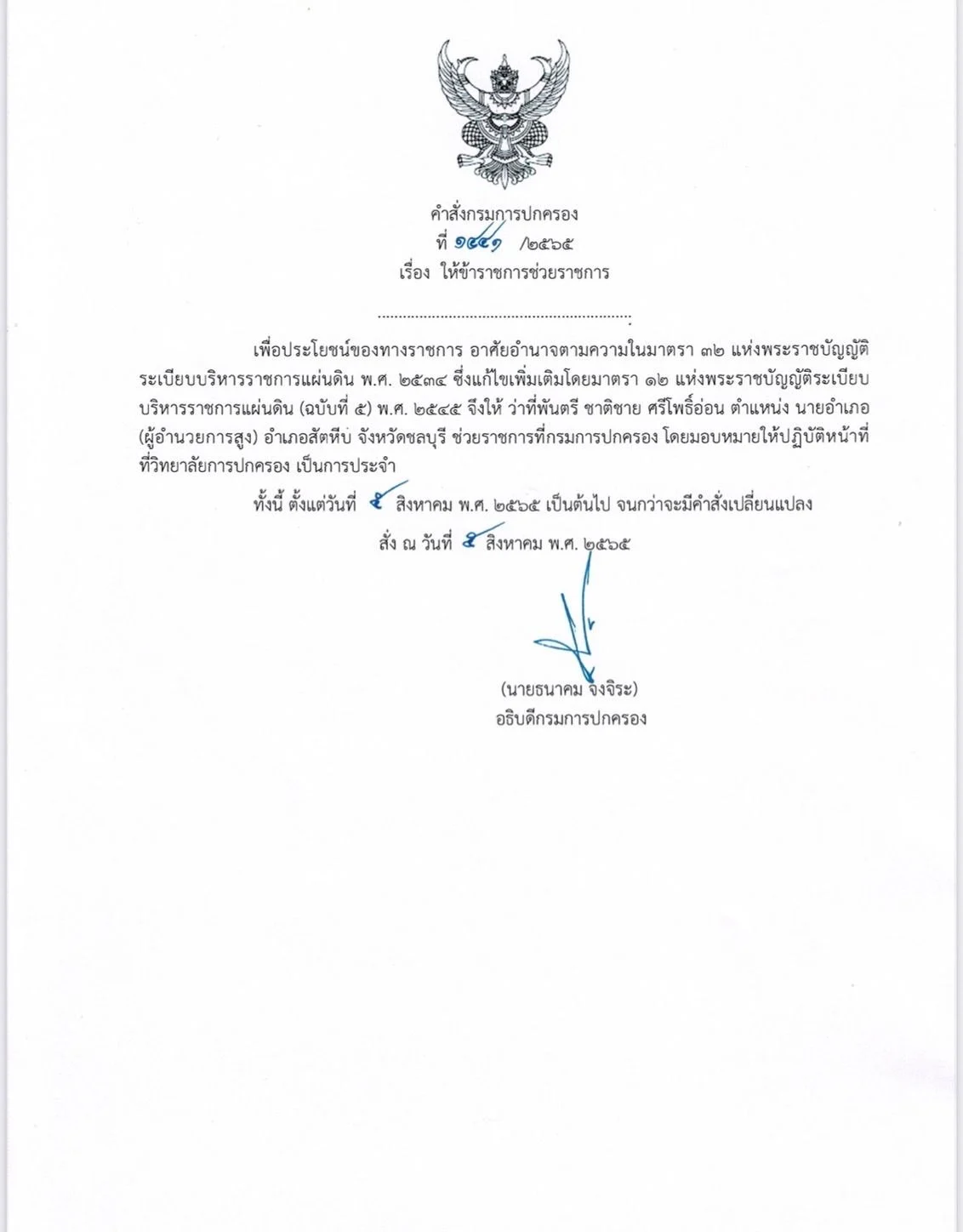 นายธนาคม จงจิระ อธิบดีกรมการปกครอง ลงนามในคำสั่งกรมการปกครองวันที่ 5 ส.ค. 2565 สาระสำคัญระบุว่า เพื่อประโยชน์ของทางราชการ อาศัยอำนาจตามความในมาตรา 32 แห่งพระราชบัญญัติ ระเบียบราชการแผ่นดิน พ.ศ. 2534 ซึ่งแก้ไขเพิ่มเติมโดยมาตรา 12 แห่งพระราชบัญญัติระเบียบราชการแผ่นดิน (ฉบับที่ 5) พ.ศ. 2545 ให้ว่าที่พันตรีชาติชาย ศรีโพธิ์อ่อน ตำแหน่งนายอำเภอสัตหีบ จังหวัดชลบุรี ไปช่วยราชการที่กรมการปกครอง โดยมอบหมายให้ปฏิบัติหน้าที่ที่วิทยาลัยการปกครองเป็นการประจำ ตั้งแต่วันที่ 5 สิงหาคม 2565 เป็นต้นไป จนกว่าจะมีคำสั่งเปลี่ยนแปลง