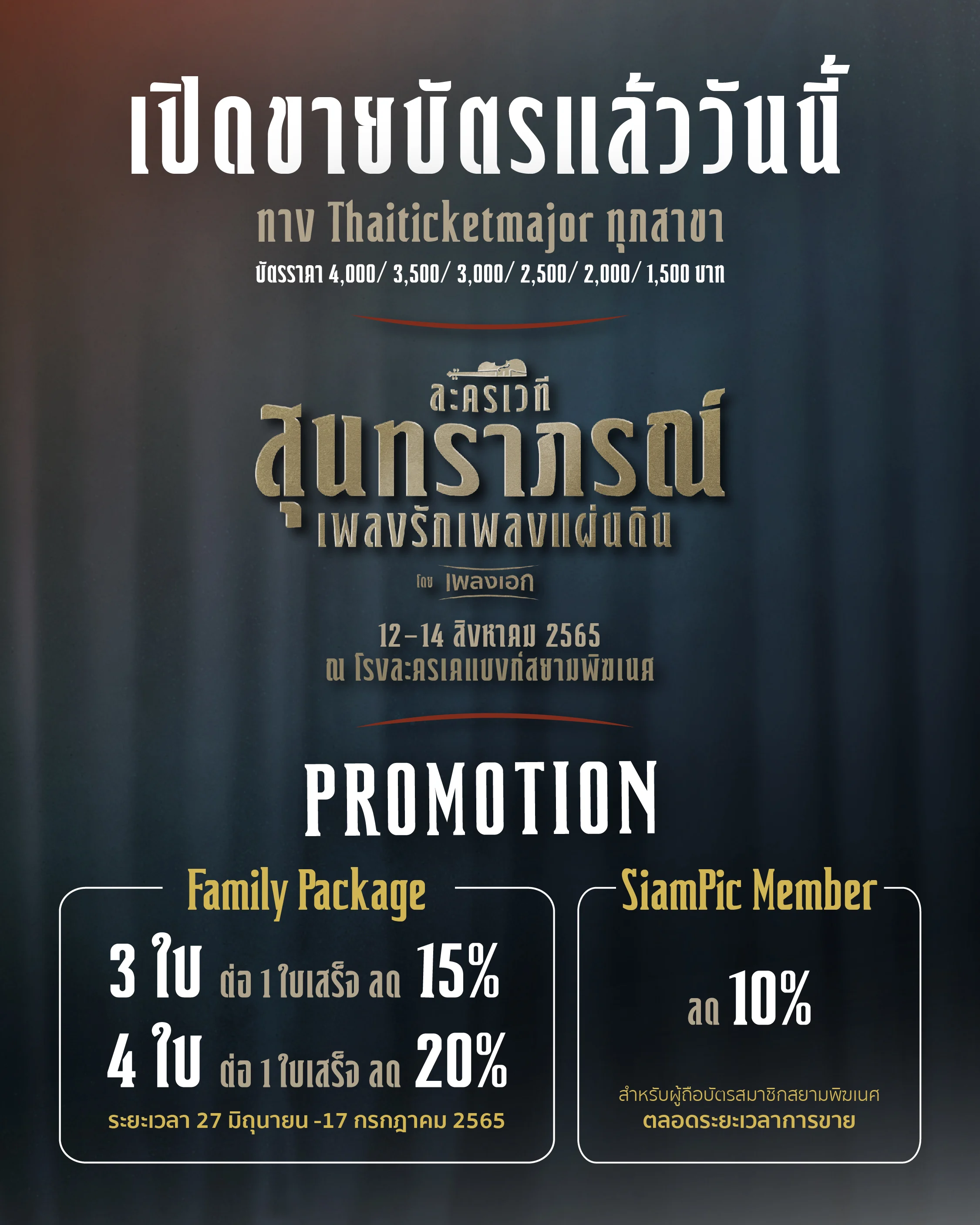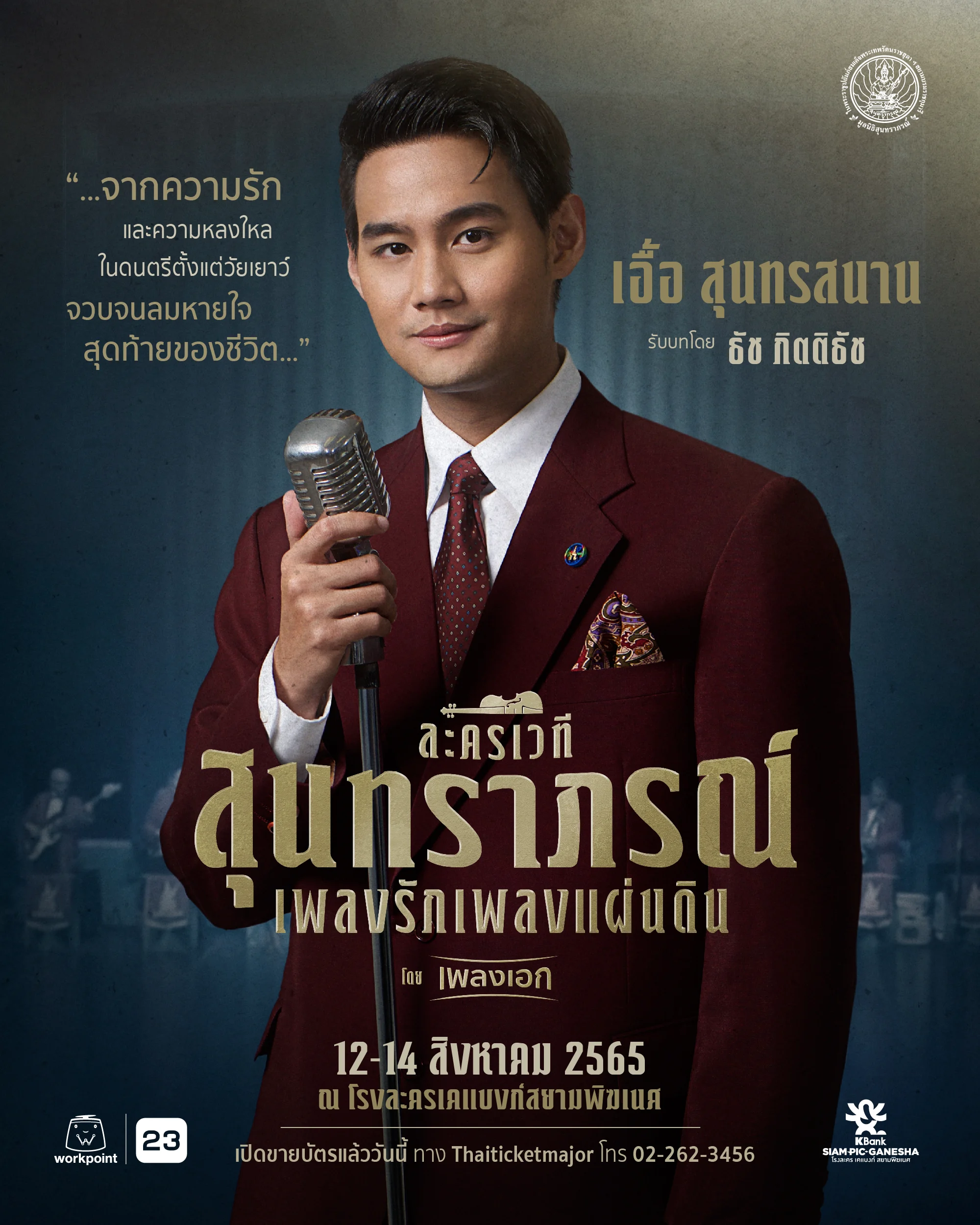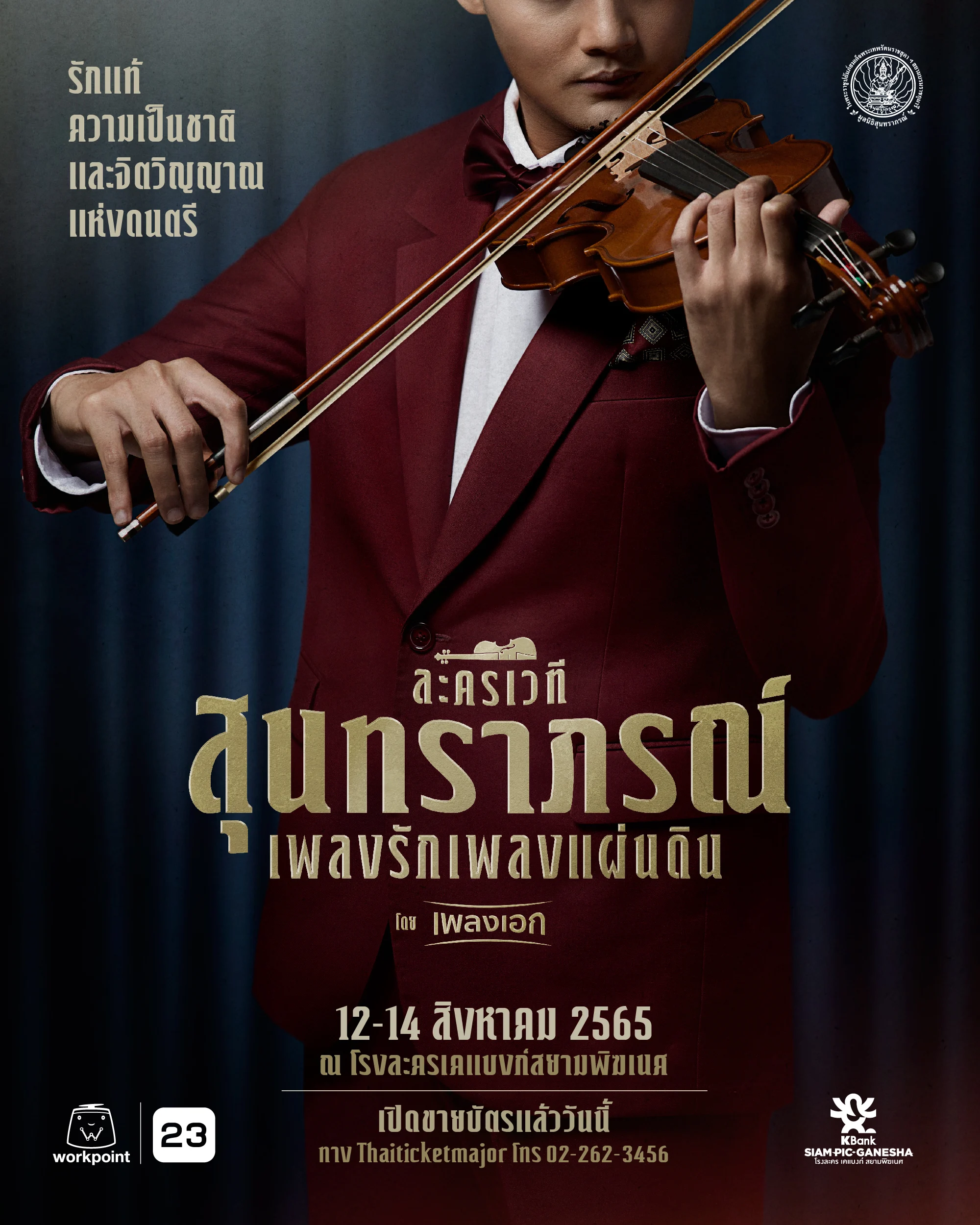 ‘ละครเวทีสุนทราภรณ์ เพลงรักเพลงแผ่นดิน โดยเพลงเอก’ จัดแสดงในวันที่ 12-14 ส.ค.นี้ ณ โรงละครเคแบงก์สยามพิฆเนศ ชั้น7 สยามสแควร์วัน บัตรราคา : 4,000 / 3,500 / 3,000 / 2,500 / 2,000 และ 1,500 บาท เปิดขายบัตรวันนี้แล้วทาง Thaiticketmajor