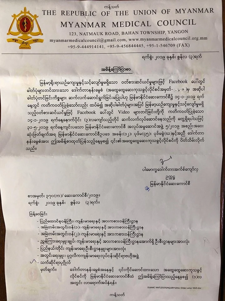 จดหมายดังกล่าว ยังระบุอีกว่า สิ่งที่เธอโพสต์ไม่สอดคล้องกับวัฒนธรรมประเพณีของเมียนมา โดยเมื่อเดือน ม.ค. 62 แพทยสภาเคยตักเตือนเธอมาแล้วรอบหนึ่ง เธอรับปากว่าจะปรับปรุงตัว แต่กลับไม่ทำตามนั้น