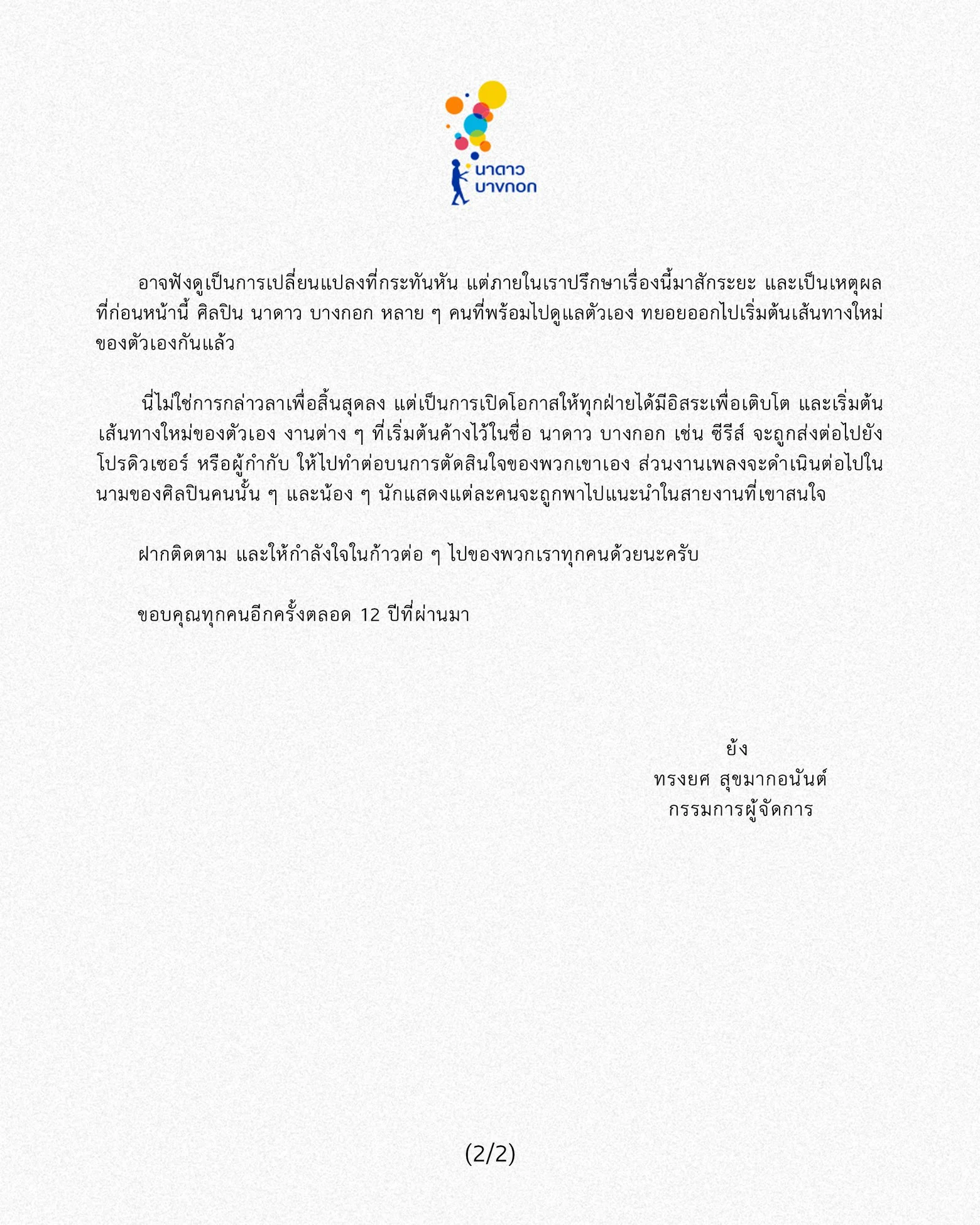 โดยระบุใจความว่า “ตลอด 12 ปีที่ผ่านมาของ นาดาว บางกอก หน้าที่หลักของพวกเราคือการพัฒนาและดูแลศิลปิน โดยมีความตั้งใจในการค้นหา พัฒนา และดูแลให้เกิดนักแสดง หรือศิลปิน ที่มีความสามารถ มีคุณภาพในทุกด้าน เพื่อที่จะเป้นทางเลือกใหม่ๆ และสร้างความหลาดหลายให้อุสาหกรรมบันเทิงไทย