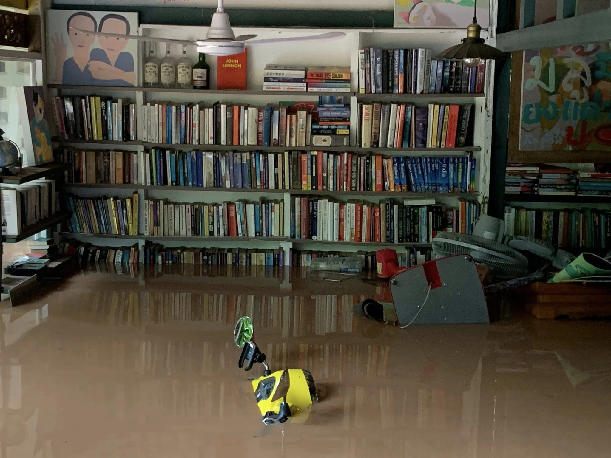 สุดท้ายน้ำก็เริ่มขยับเข้าถึงพื้นห้องสมุด พื้นที่ขายหนังสือ จุดอ่านหนังสือ ถึงตอนนั้น ครูต้อมรู้ดีว่า ทำไม่ได้ไปมากกว่านี้แล้ว เพราะสองแรงของครูและแม่ เหน็ดเหนื่อยมาก จากการเก็บของมาสองวันติด แถมยังมีอาการบาดเจ็บบริเวณหลังเป็นอุปสรรคใหญ่