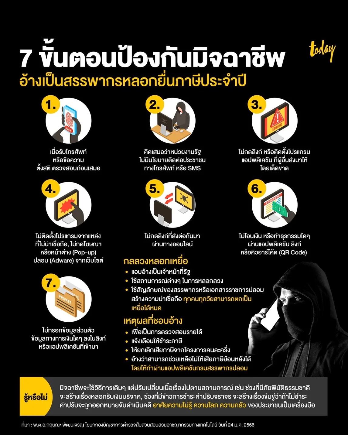 จึงขอย้ำเตือนประชาชน อย่าหลงเชื่อการแอบอ้างเป็นเจ้าหน้าที่สรรพากรโทรหา ส่ง SMS แจ้งให้ประชาชนยื่นแบบหรือให้ชำระภาษีประจำปี เพราะอาจทำให้ท่านได้รับความเสียหายต้องสูญเสียทรัพย์สินได้