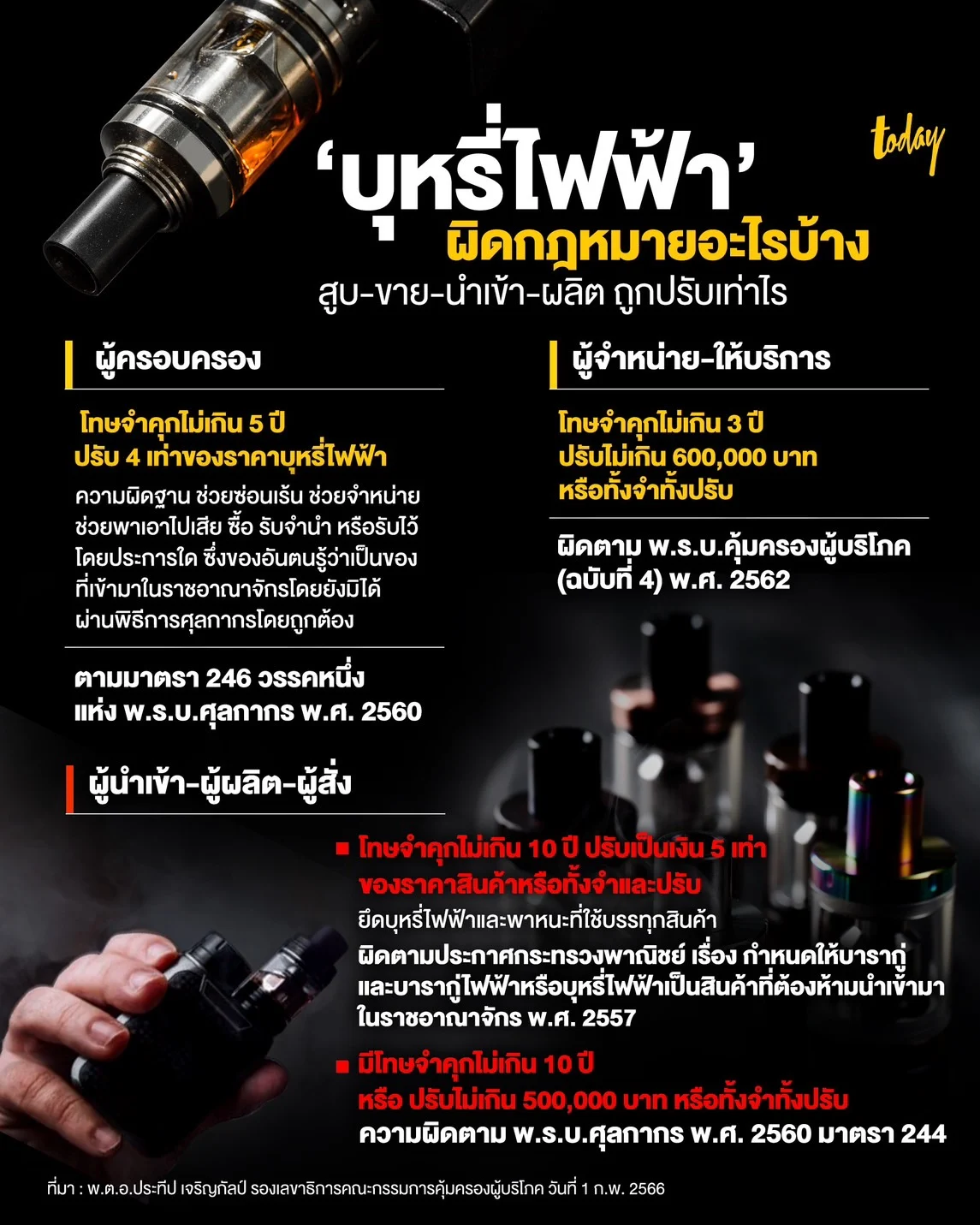 โฆษกคณะกรรมการคุ้มครองผู้บริโภค ไขข้อข้องใจ ‘บุหรี่ไฟฟ้า’ ผิดกฎหมาย ผู้ครอบครองมีความผิดโทษจำคุกไม่เกิน 5 ปี หรือปรับเป็นเงิน 4 เท่าของราคาสินค้า หรือทั้งจำทั้งปรับ ลักลอบนำเข้าโทษจำคุกไม่เกิน10 ปี หรือ ปรับไม่เกิน 500,000 บาท หรือทั้งจำทั้งปรับ