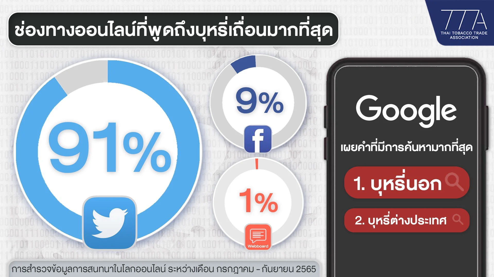 จาผลสำรวจข้อมูลการสนทนาในโลกออนไลน์ สมาคมการค้ายาสูบไทยพบว่า การกล่าวถึงและสนทนาถามซื้อและเสนอขายผ่านช่องทางออนไลน์ต่างๆ เกี่ยวกับบุหรี่เถื่อน ในระยะเวลา 3 เดือนตั้งแต่เดือนกรกฎาคม, สิงหาคม และกันยายน 2565 มีความเคลื่อนไหวเพิ่มขึ้นเฉลี่ย 97% โดยช่องทางที่ถูกใช้เพื่อพูดถึงเรื่องบุหรี่เถื่อนมากที่สุด คือทวิตเตอร์ 91% รองลงมาคือ เฟซบุ๊ก 9% และเว็บบอร์ด 1% ซึ่งคีย์วิ์ดที่มักจะใช้สื่อสารกันในออนไลน์คือ บุหรี่นอก และบุหรี่ต่างประเทศ รวมถึงการที่โพสต์หรือพูดคุยกันทำให้ทราบสาเหตุลักๆ ที่ทำให้บุหรี่เถื่อนกลายเป็นที่นิยมสำหรับลูกค้าในออนไลน์คือ ราคาถูกกว่าบุหรี่ขายแบบถูกกฎหมาย รสชาติ และช่องทางซื้อขายที่ง่ายและสะดวกกว่า สอดคล้องกับที่การยาสูบแห่งประเทศไทยออกมาให้ข่าวก่อนหน้านี้ว่าภาษีบุหรี่ที่สูงขึ้นทำให้บุหรี่ถูกกฎหมายมีราคาแพงขึ้นจากประมาณ 50 บาท เป็นขั้นต่ำ อยู่ที่ราคา 66 บาท