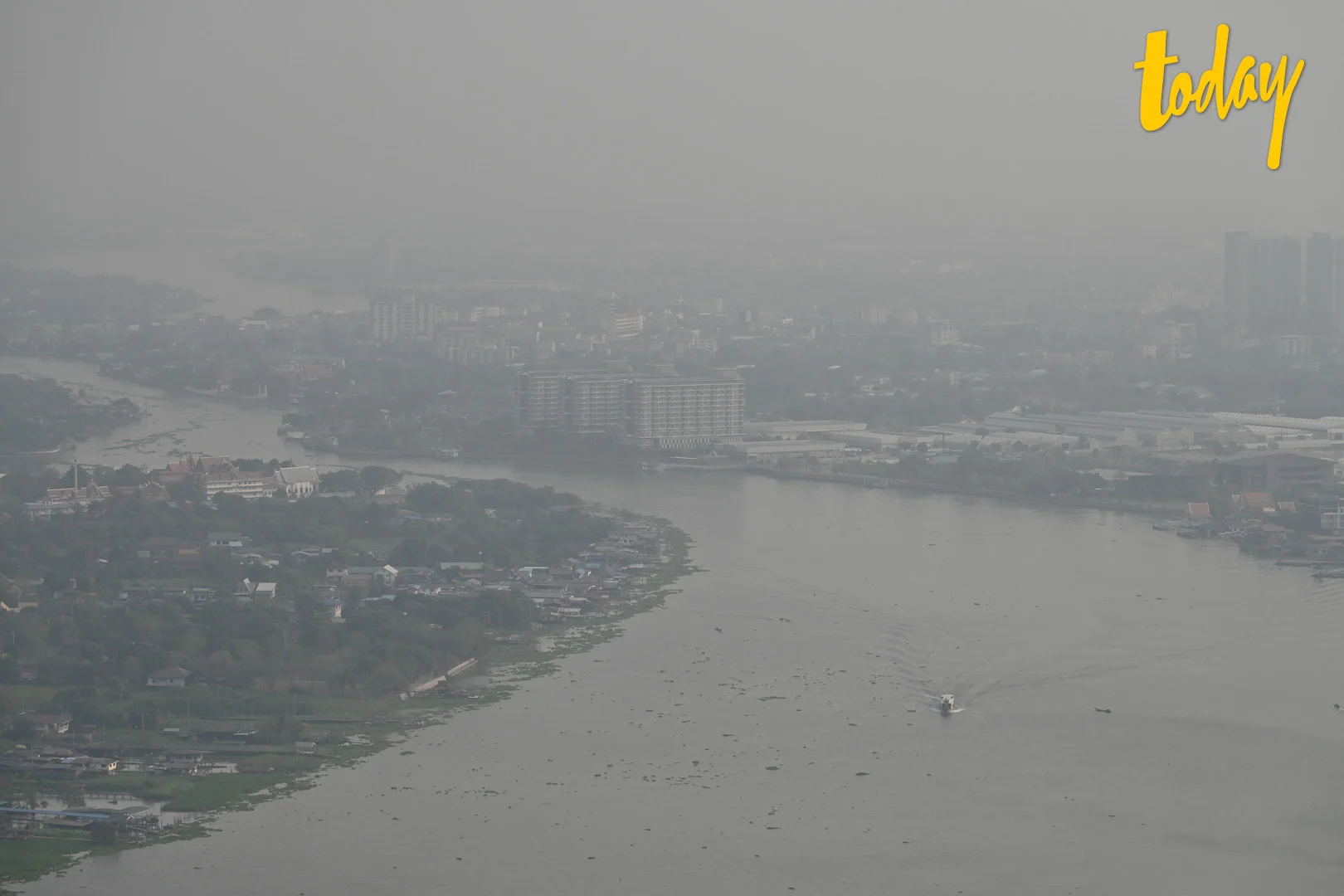 ภาพบรรยากาศมุมสูงในพื้นที่กรุงเทพมหานครและ จ.นนทบุรี เช้าวันนี้ พบว่ายังคงมีฝุ่น PM 2.5 ปกคลุมหนาแน่นอย่างเห็นได้ชัด