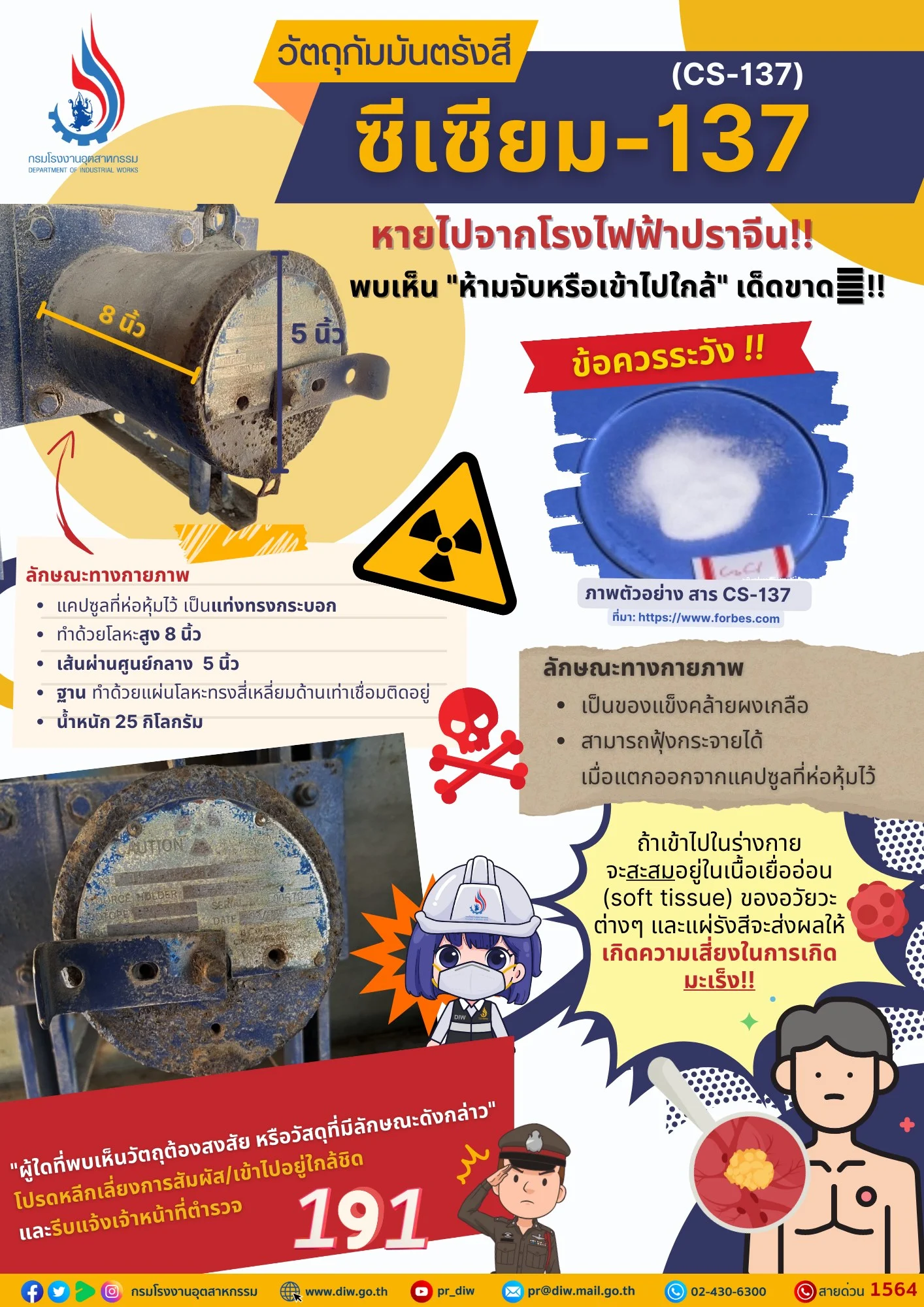 จากกรณีท่อเก็บสารกัมมันตรังสี ‘ซีเซียม-137’ (Sesium-137) เป็นวัสดุทรงกลม ยาว 8 นิ้ว กว้าง 5 นิ้ว หนัก 25 กก. หายไปจากโรงงานไฟฟ้าแห่งหนึ่งใน อ.ศรีมหาโพธิ จ.ปราจีนบุรี เมื่อหลายวันก่อน ยังค้นหาไม่พบ ล่าสุดเจ้าหน้าที่ได้ตั้งรางวัล 50,000 บาท สำหรับคนที่ให้ข้อมูลนำสารดังกล่าวกลับคืนมาได้