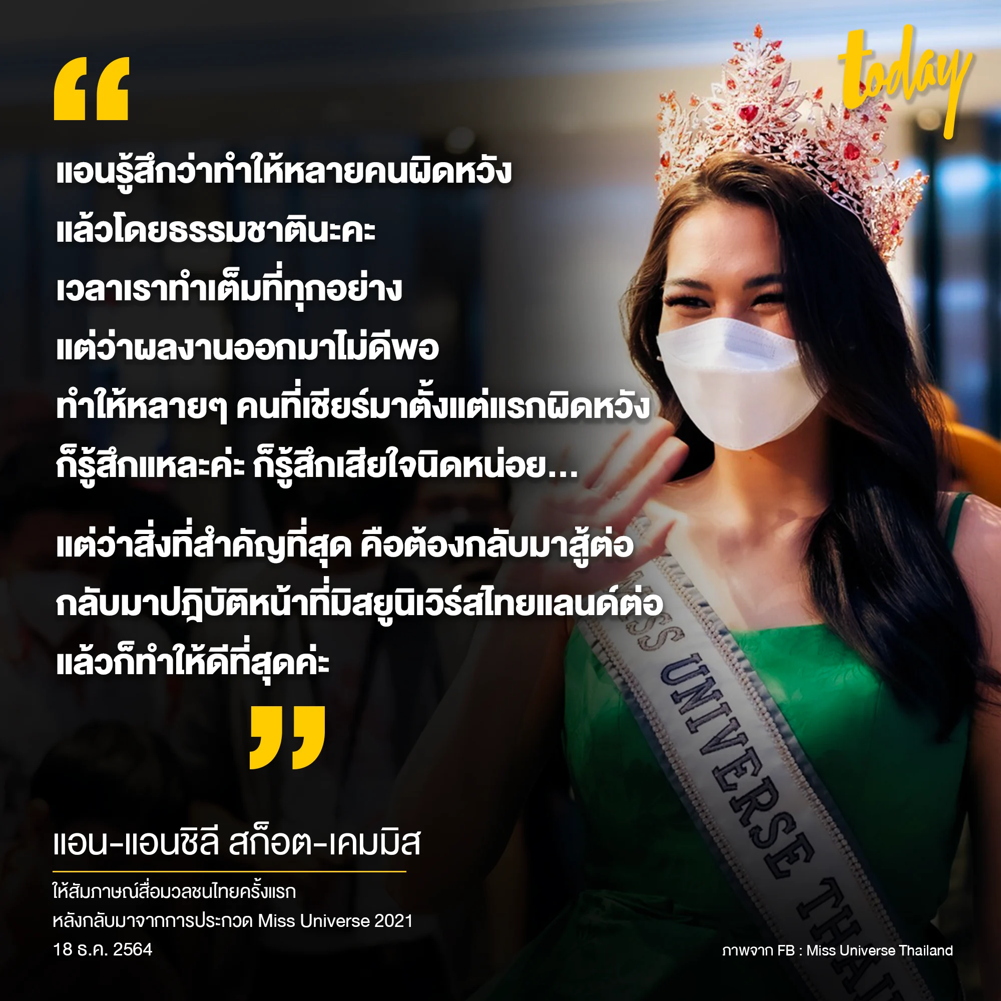 แอนรู้สึกว่าทำให้หลายคนผิดหวังแล้วโดยธรรมชาติเวลาเราเต็มที่ทุกอย่างหรือว่าผลงานออกมาที่ไม่ดีพอและทำให้หลายๆ คนเชียร์มาตั้งแต่แรกผิดหวัง แอนก็รู้สึกแหละ รู้สึกเสียใจนิดหน่อย แต่ว่าสิ่งที่สำคัญที่สุดคือต้องกลับมาสู้ต่อ กลับมาปฏิบัติหน้าที่มิสยูนิเวิร์สไทยแลนด์ต่อและทำให้ดีที่สุด