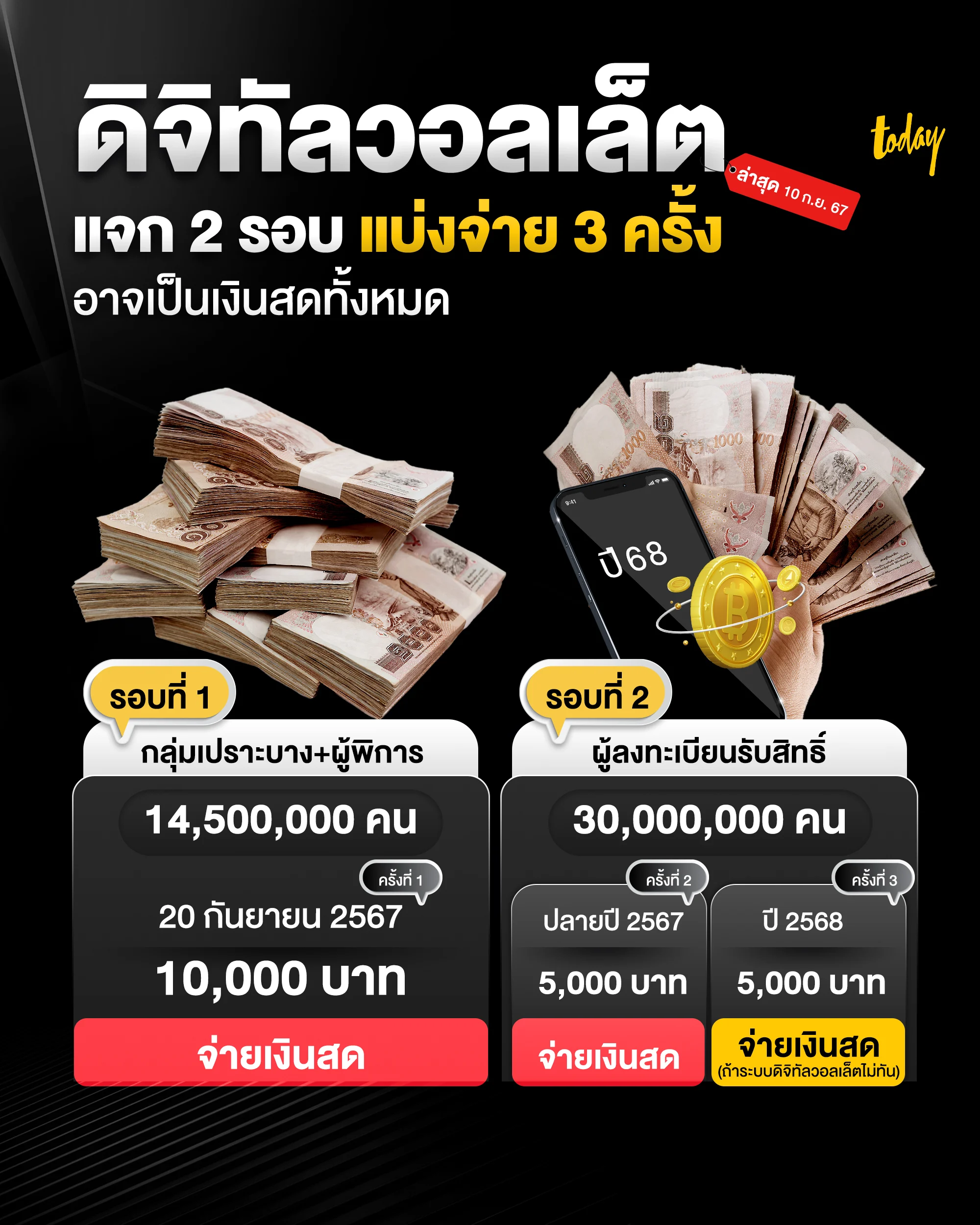 โดยเมื่อวันที่ 9 ก.ย. 2567 นายพิชัย ชุณหวชิร รองนายกรัฐมนตรี และรัฐมนตรีว่าการกระทรวงการคลัง เปิดเผยว่า รัฐบาลจะโอนเงิน 10,000 บาทให้กับกลุ่มเปราะบางและคนพิการ ซึ่งน่าจะมีประมาณ 14.5 ล้านคน เป็นกลุ่มแรก พร้อมคาดการณ์ว่า จะโอนเงินให้สักช่วงวันที่ 20 ก.ย.นี้ โดยจะจ่ายเป็นเงินสด