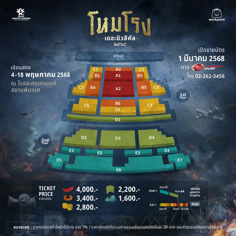 ผังที่นั่งมีชั้น 1 และชั้น 2 ราคาบัตร 4,000 / 3,400 / 2,800 / 2,200 / 1,600