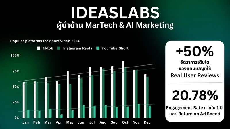 IdeasLabs เผยเทรนด์คลิปสั้นมาแรงสุด ครองใจนักการตลาดอันดับหนึ่ง เหตุช่วยในการสร้างคอนเทนต์รูปแบบ รีวิวผู้ใช้จริง (Real User Reviews) มีอัตราการเติบโตของแคมเปญเฉลี่ยถึง 50% ต่อเดือน