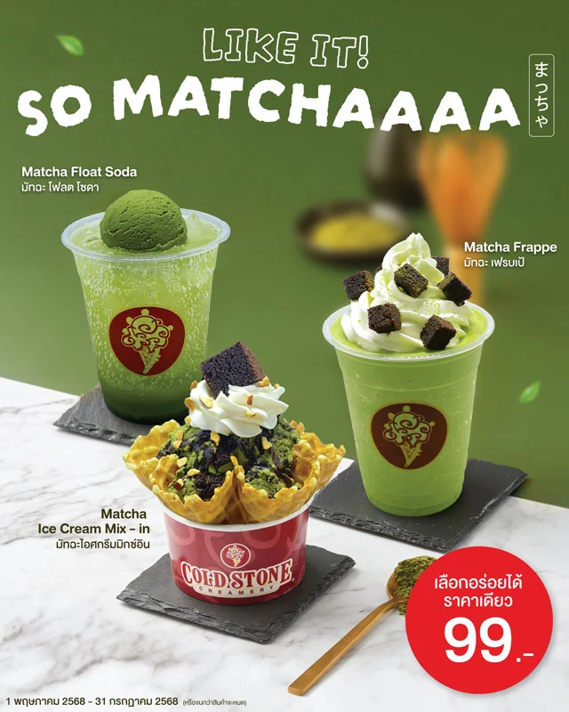 ไม่ทำให้ Matcha Lover ผิดหวังแน่นอน กับ “LIKE IT! SO MATCHAAA” ที่นำไอศกรีมมัทฉะระดับซูเปอร์ พรีเมี่ยมมารังสรรค์เป็นเมนูใหม่ออกมาให้คุณถึง 3 เมนูด้วยกัน เริ่มกันที่ Matcha Ice Cream Mix-in ไอศกรีมมัทฉะรสเข้มข้นกลมกล่อม ราดซอสช็อกโกแลต โปะด้านบนด้วยวิปครีมนุ่ม ๆ และบราวนีเนื้อแน่นชิ้นโต เสิร์ฟพร้อมวาฟเฟิลกรอบกลิ่นหอม ๆ มิกซ์เข้าด้วยกันแล้วอร่อยลงตัวสุด ๆ ต่อกันที่ Matcha Float Soda ไอศกรีมมัทฉะดื่มคู่กับโซดา ซ่าสดชื่น ไม่เหมือนใครแน่นอน และเมนูสุดท้าย Matcha Frappe ไอศกรีมมัทฉะรสเข้มข้นที่นำไปปั่นเป็นเฟรบเป้เพิ่มความละมุน และอัพความฟินขึ้นไปอีกขั้นด้วยท็อปปิ้งวิปครีมและบราวนีชิ้นพอดีคำ โดยทั้งหมดนี้เลือกอร่อยได้ในราคาเดียวเพียง 99 บาท เท่านั้น! Matcha Lover มาทานกันได้แล้วตั้งแต่นี้ถึง 31 กรกฎาคม 2568 ที่ร้านโคล สโตน ครีมเมอรี่ ทุกสาขา