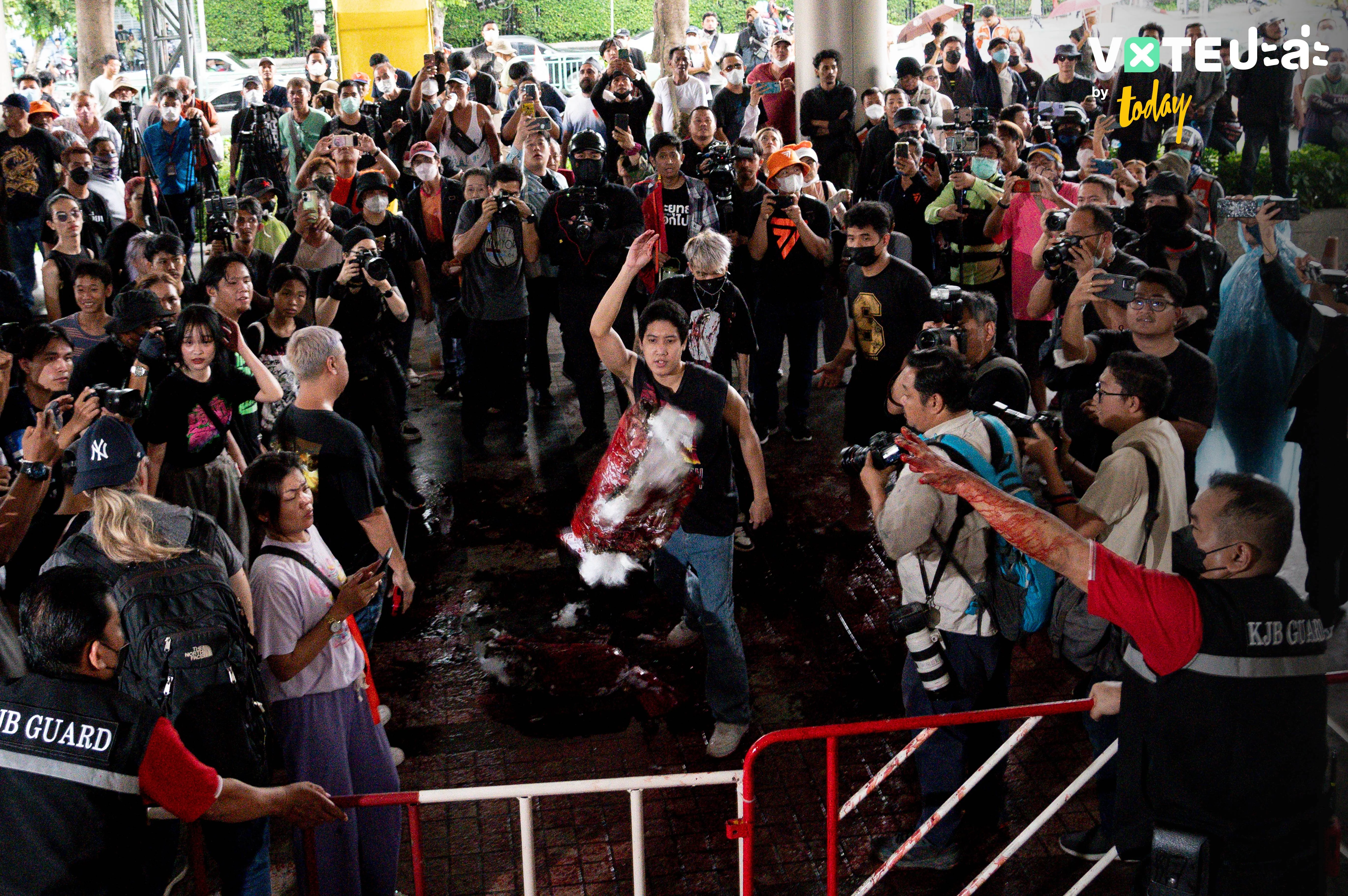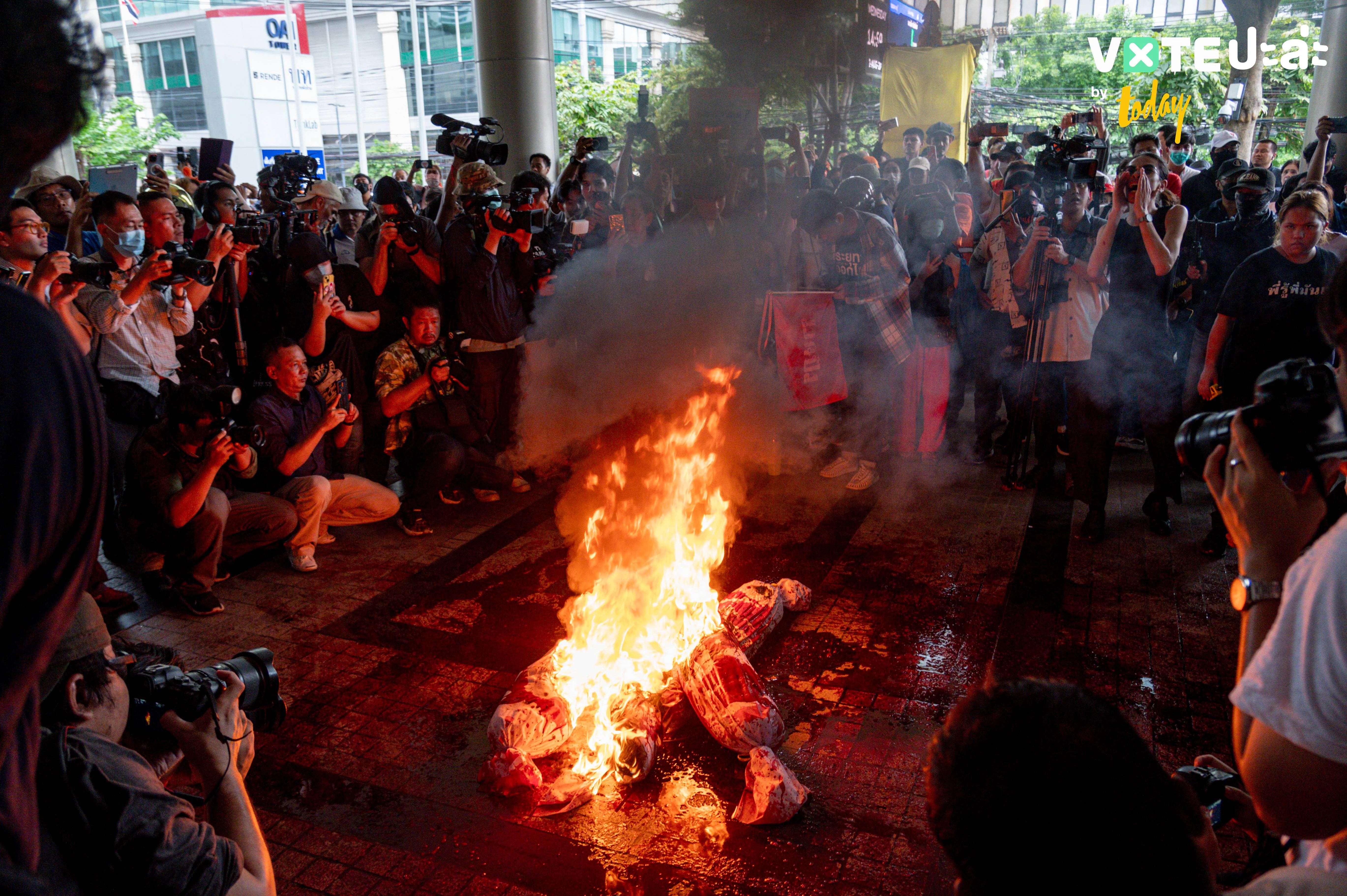 หลังการแถลงข่าวของพรรคเพื่อไทยเสร็จสิ้น กลุ่มผู้ชุมนุมทะลุวัง เดินทางมาบริเวณด้านหน้า ที่ทำการพรรคเพื่อไทย โดยนำหุ่นผ้าขาวดิบ 3 อัน แสดงออกเชิงสัญลักษณ์เป็นตัวแทนคนเสื้อแดง 99 ศพ ที่เสียชีวิต จากเหตุการณ์การชุมนุมในวัดปทุมวนาราม และบุคคลที่ถูกอุ้มหายในช่วงหลังการรัฐประหารปี 2557 โดยนำมาราดน้ำมันก๊าซ และสาดเลือดหมู และจุดไฟเผา พร้อม ตะโกนต่อว่าพรรคเพื่อไทยว่า “ลืมคนเสื้อแดง ที่เคยสละชีวิตเพื่อประชาธิปไตยไปแล้วหรือ ผิดคำสัญญาไปได้อย่างไร หักหลังประชาชนและหักหลังคนเสื้อแดง”