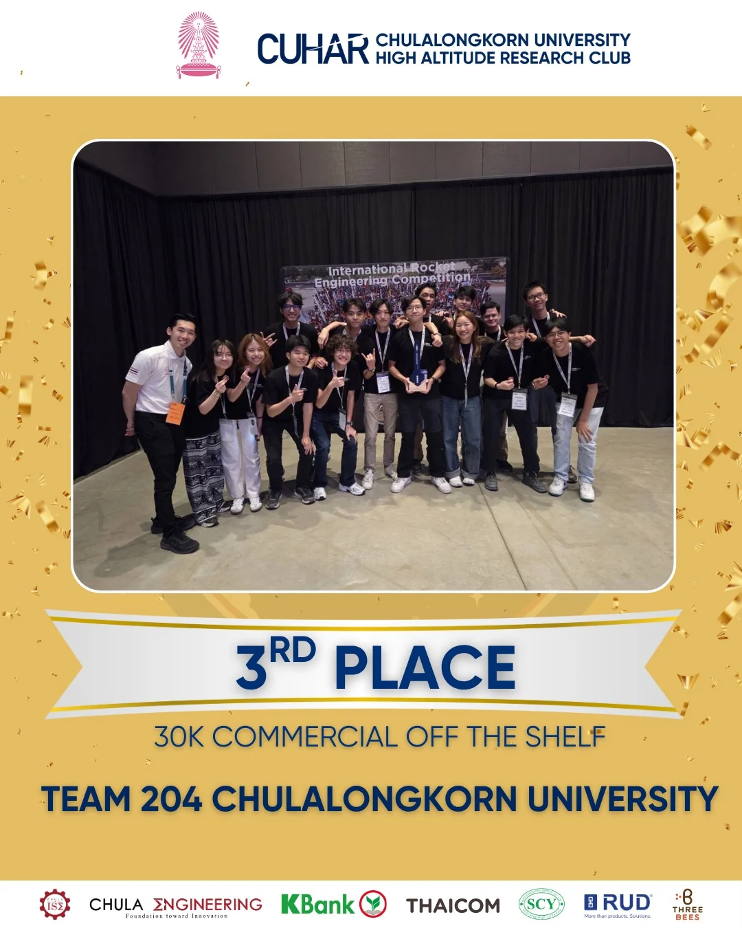 ขอแสดงความยินดีกับ TEAM 204 นิสิตไทยจาก CUHAR คว้าอันดับ 3 การแข่งขันในหมวด 30K COTS ในการแข่งจรวดระดับอุดมศึกษานานาชาติที่ใหญ่สุดของโลก