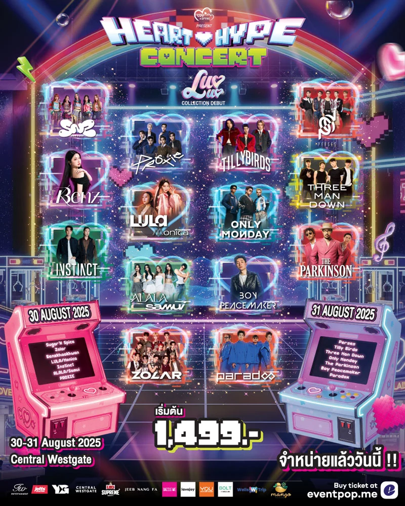 เตรียมมา Hype ให้ใจสั่น แล้วกรี๊ดตั้งแต่เที่ยงวันยันเที่ยงคืนกันจนเสียงแหบ! กับมหกรรมคอนเสิร์ตที่จะทำให้คนมีดนตรีในหัวใจต้องใจเต้นแรง “Luv N Spyre present Heart Hype Luv Luv Collection Debut Concert” ด้วยส่วนผสมของไลน์อัพศิลปินไทยชั้นนำกว่า 60 ชีวิต ที่ลงตัว ครบรส มางานเดียวเต็มอิ่ม จุใจ ทั้ง T-POP, T-BAND, สายแดนซ์, สายโวคอล และสายคิ้วท์ ไม่ว่าจะเป็น PROXIE, Perses, Zolar, Sugar’N Spice, Benzkhaokhwan, Three Man Down, Tilly Birds, Only Monday, The Parkinson, Boy Peacemaker, Paradox, LULA , Monica, Instinct, ALALA และ Samui เตรียมเช็คอินแล้วไปฟินกับทุกโมเมนต์ ในวันเสาร์ที่ 30 และวันอาทิตย์ที่ 31 สิงหาคม 2568 นี้ ที่ เวสต์เกต ฮอลล์ ชั้น 4 ศูนย์การค้า เซ็นทรัลพลาซา เวสต์เกต