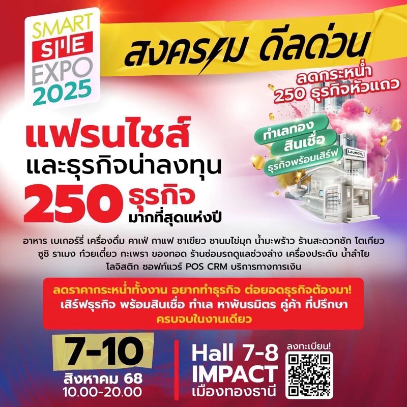 ผู้ที่มองหาอาชีพ ผู้ว่างงาน วัยเกษียณ หรือผู้สนใจลงทุนธุรกิจพลาดไม่ได้ งาน Smart SME EXPO 2025 จัดระหว่างวันที่ 7-10 สิงหาคม 2568 เวลา 10.00-20.00 น. ฮอลล์ 7-8 อิมแพ็คเมืองทองธานี (เดินทางโดยรถยนต์ส่วนตัวมีบริการที่จอดรถมากมาย หรือรถไฟฟ้าสายสีชมพู)