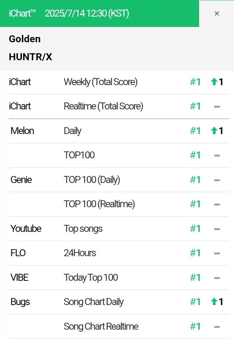 นอกจากนี้ “Golden” ยังทำลายสถิติ Perfect All-Kill ในเกาหลี โดยเป็นเพลงที่ 3 ที่ทำได้ในปี 2025 ต่อจาก “REBEL HEART” ของ IVE และ “TOO BAD” ของ G-Dragon’s feat. Anderson .Paak. อีกทั้งยังเอาชนะ “Ditto” ของ NewJeans ขึ้นแท่นเพลงที่ทำ Perfect All-Kill ได้มากที่สุด (656 ครั้ง และยังนับต่อ) ในเกาหลีใต้อีกด้วย ในประเทศไทยสามสาว HUNTR/X ก็ได้อวดโฉมขึ้นปกเพลย์ลิสต์ HOT HITS THAILAND ของ Spotify อีกด้วย ปีนี้เป็นปีทองของ KPop Demon Hunters จริง ๆ
