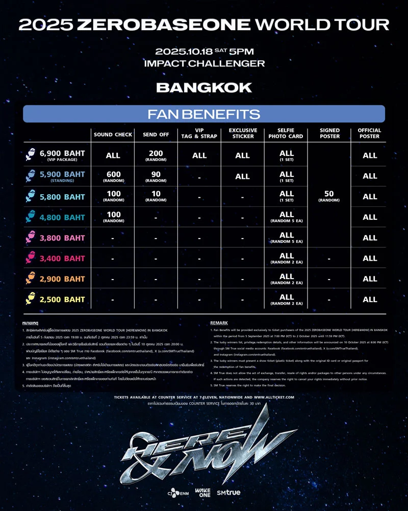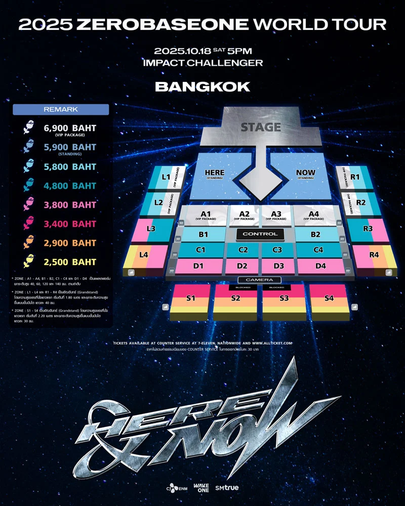 รับรองว่า [HERE&NOW] ที่มีเพียงแค่ ZEROBASEONE (ซีโรเบสวัน) และ ZEROSE (เจโรส) อยู่เคียงข้างกันตลอดการเดินทาง จะกลายเป็นช่วงเวลาที่ดีที่สุดตลอดกาล และน่าจดจำที่สุดในชีวิต เปิดจำหน่ายบัตรรอบสมาชิก Global Official Fanclub ‘ZEROSE’ Pre-Sale ในวันศุกร์ที่ 5 กันยายน 2025 เวลา 19:00 น. – 23:59 น., รอบสมาชิก JOY-CLUB Pre-Sale วันเสาร์ที่ 6 กันยายน 2025 เวลา 11:00 น. – 15:59 น. และรอบบุคคลทั่วไป วันอาทิตย์ที่ 7 กันยายน 2025 ตั้งแต่เวลา 11:00 น. เป็นต้นไป ทางเคาน์เตอร์เซอร์วิสในร้าน 7-Eleven ทุกสาขาทั่วประเทศ และทางเว็บไซต์ www.allticket.com/event/ZEROBASEONE_HEREANDNOW_IN_BANGKOK บัตรราคา 6,900 (VIP PACKAGE) / 5,900 (บัตรยืน) / 5,800 / 4,800 / 3,800 / 3,400 / 2,900 / 2,500 บาท พร้อมสิทธิพิเศษสำหรับผู้ซื้อบัตร