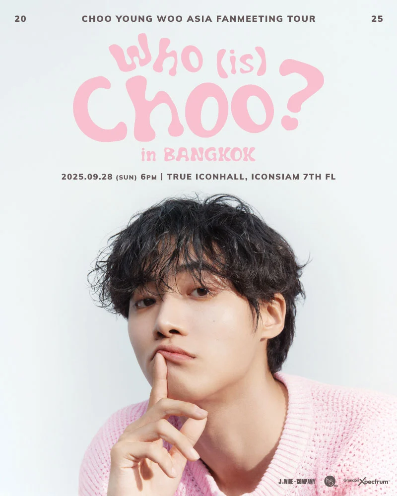 และล่าสุดตอกย้ำความปังเกินต้านกับการต้องรับบทเป็น 2 ตัวละครใน The Tale of Lady Ok บทแพทย์ฉุกเฉินหัวใจนักสู้ใน The Trauma Code: Heroes on Call และหนุ่มหล่อเย็นชาลึกลับจาก Head Over Heels เตรียมตัว เตรียมเสียงกรี๊ดให้พร้อม เพราะเขากำลังจะหลุดออกมาจากหน้าจอ มาพบกับแฟน ๆ แบบตัวจริงเสียงจริง ในงานแฟนมีตติ้งครั้งแรกที่ประเทศไทย กับ “2025 CHOO YOUNG WOO ASIA FANMEETING TOUR [Who (is) Choo?] in BANGKOK” วันอาทิตย์ที่ 28 กันยายน 2568 ณ TRUE ICON HALL ชั้น 7 ICONSIAM งานนี้ผู้จัด Grandprix Xpectrum โดยพีระพงศ์ เอื่ยมลำเนา มือไวคว้าตัวหนุ่มฮอตมาส่งตรงความฟินให้แฟนคลับชาวไทยแบบไม่มีกั๊ก