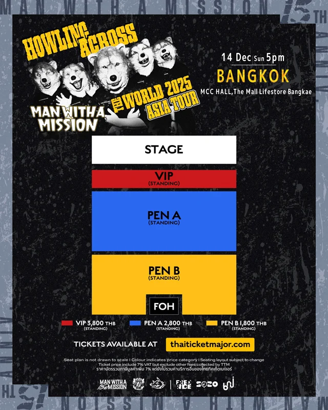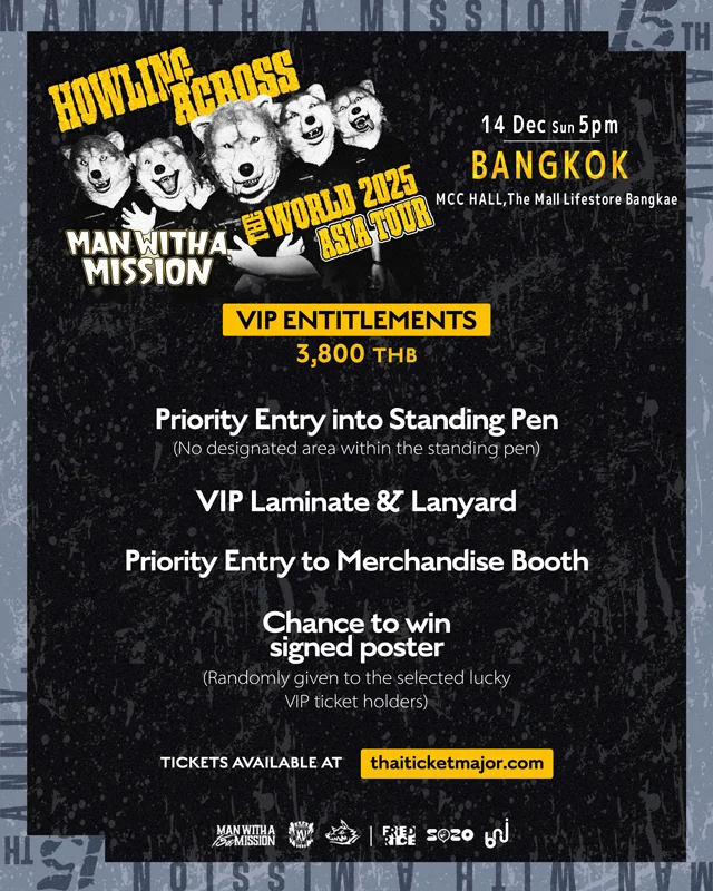 แฟน ๆ ชาวไทยจะได้เต็มอิ่มไปกับทั้งเพลงใหม่และเพลงฮิตจากอนิเมะชื่อดัง เช่น “Merry-Go-Round” จาก My Hero Academia และ “My Hero” จาก Inuyashiki อีกด้วย บัตรคอนเสิร์ต MAN WITH A MISSION “HOWLING ACROSS THE WORLD 2025 – ASIA TOUR” in BANGKOK จะเปิดจำหน่ายทั่วไปในวันที่ 31 สิงหาคม 2568 เวลา 14:00 น. ผ่านทาง thaiticketmajor.com