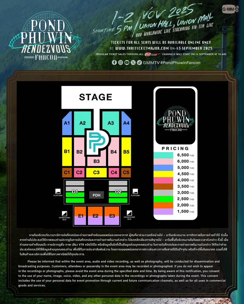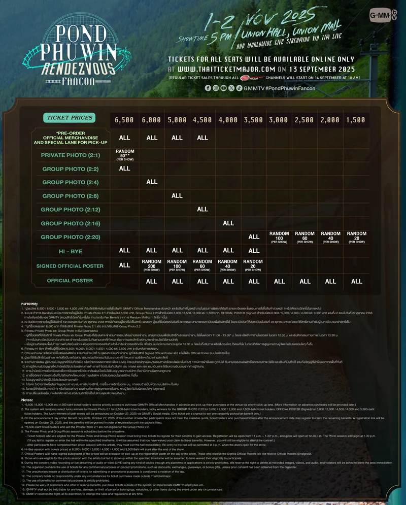 สำหรับผู้สนใจสามารถจับจองบัตรงาน “POND PHUWIN RENDEZVOUS FANCON” บนช่องทางออนไลน์ ในวันเสาร์ที่ 13 กันยายนนี้ เริ่มเวลา 10.00 น. เป็นต้นไป เปิดจำหน่ายทุกที่นั่ง ทางออนไลน์ที่ www.thaiticketmajor.com เท่านั้น และ เปิดจำหน่ายบัตร ทุกช่องทางตามปกติ ในวันอาทิตย์ที่ 14 กันยายน 2568 เริ่มเวลา 10.00 น. เป็นต้นไป
