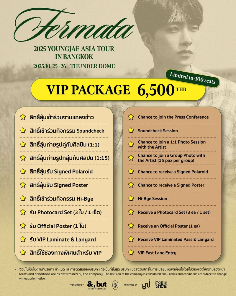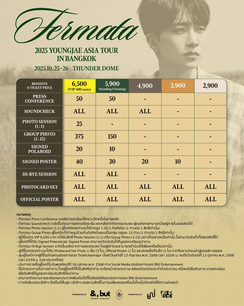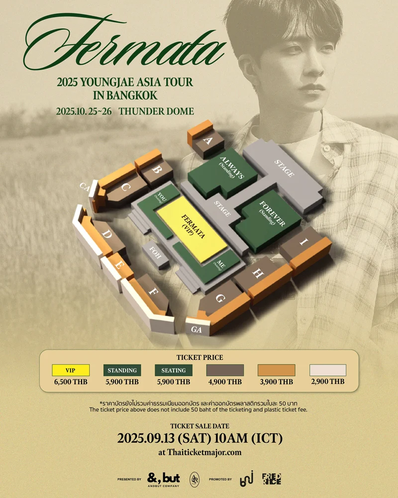 อากาเซ่ชาวไทยได้เฮกันสุดเสียงแน่นอนเพราะ “ยองแจ” กำลังจะกลับมาสร้างช่วงเวลาแห่งความทรงจำอันแสนพิเศษกับทุกคนให้หายคิดถึงในคอนเสิร์ต “2025 YOUNGJAE ASIA TOUR [Fermata] IN BANGKOK” โดยทางต้นสังกัด AndBut Company จับมือกับผู้จัด BNJ Entertainment และ FriedRice Entertainment ที่ครั้งนี้จัดเต็มถึง 2 รอบการแสดง คือ วันเสาร์ที่ 25 ตุลาคม 2025 และวันอาทิตย์ที่ 26 ตุลาคม 2025 ณ ธันเดอร์โดม เมืองทองธานี บัตรราคา 6,500 บาท / 5,900 บาท / 4,900 บาท / 3,900 บาท / 2,900 บาท พร้อมสิทธิพิเศษที่แฟน ๆ จะได้รับอีกมากมาย