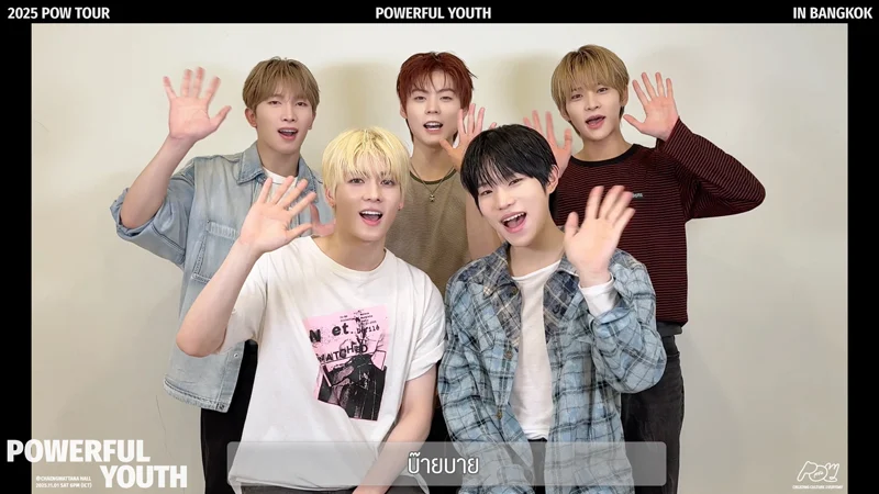 “สวัสดีครับ POW นะครับ ทุกคนพร้อมจะเจอกับอะไรที่ POWERFUL หรือยังครับ พวกเราตื่นเต้นมากสำหรับ 2025 POW TOUR: POWERFUL YOUTH in BANGKOK เป็นทัวร์คอนเสิร์ตครั้งแรกของพวกเราเลยครับ เป็นช่วงเวลาที่เหมาะที่สุด ในการฉลองเดบิวต์ครบรอบ 2 ปีของพวกเรา พวกเรามีอะไรจะโชว์ให้ทุกคนดูเยอะมาก เพราะฉะนั้นมาสนุกไปด้วยกันกับพวกเรานะครับ มาร้องเพลงโปรดของพวกเราด้วยกันนะครับ แฟนๆ เตรียมมาเติม POW กันให้เต็มที่นะครับ พวกเราก็รอเติม POWER จากทุกคนอยู่เหมือนกัน อย่าลืมกดบัตรให้ทัน วันที่ 1 พฤศจิกายนนี้ มาเจอกันที่แจ้งวัฒนะ ฮอลล์ ที่เซ็นทรัลแจ้งวัฒนะ นะครับ มาเติม POW กันนะครับ บ๊ายบาย”