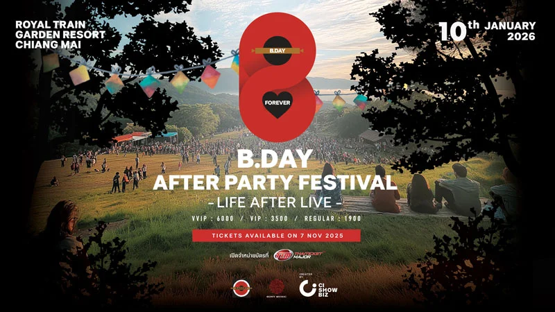 หลังจากบัตรคอนเสิร์ตใหญ่ “B.DAY Forever Concert” (5–8 ธันวาคม 2568 ณ อิมแพ็ค อารีน่า เมืองทองธานี) ถูกจำหน่ายหมดทุกที่นั่งภายในเวลาเพียง 10 นาที กระแสตอบรับจากแฟนเพลงยังคงล้นหลาม หลายคนพลาดโอกาสการเป็นส่วนหนึ่งของประสบการณ์ครั้งสำคัญ ขณะเดียวกันศิลปินก็อยากมีเวลาโชว์เต็มอิ่ม เพื่อตอบสนองทั้งแฟนเพลงและศิลปิน สามบอสแห่ง Bakery Music นำทีมโดย สุกี้–กมล สุโกศล แคลปป์, บอย–โกสิยพงษ์ และสมเกียรติ อริยะชัยพาณิชย์ ผู้บุกเบิกค่ายเพลงทันสมัยแนวเพลงอินดี้ ที่มาเปลี่ยนวิธีฟังเพลงไทยไปตลอดกาล และ Dojo City ค่ายเพลงป็อปแดนซ์สีสันสดใส ร่วมกับ ผู้จัด CI Showbiz สานต่อความสุขและพลังของเสียงดนตรี รวมพลศิลปินไปต่อที่เชียงใหม่ “B.DAY After Party Festival: Life After Live” งานดนตรีกลางแจ้งครั้งยิ่งใหญ่ที่แฟนเพลงไม่ควรพลาด ในวันเสาร์ที่ 10 มกราคม 2569 ณ บ้านสวนรถไฟรีสอร์ท (Royal Train Garden Resort) อำเภอหางดง จังหวัดเชียงใหม่ งานนี้จะพาแฟนเพลงออกเดินทางสู่ภาคเหนือ ท่ามกลางอากาศเย็นสบายและบรรยากาศเป็นกันเอง ให้ทุกคนได้เก็บเกี่ยวความสุข สร้างความทรงจำใหม่ และดื่มด่ำไปกับเสียงเพลงอีกครั้ง