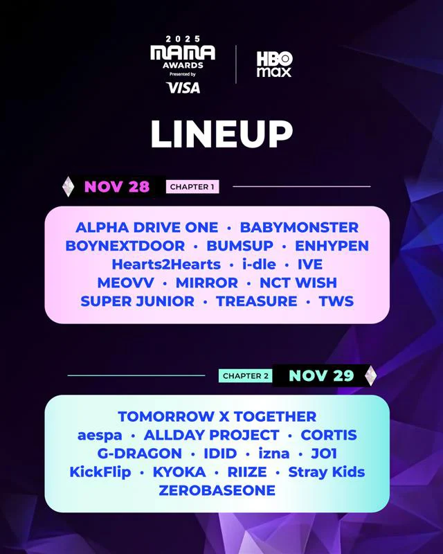 งานแสดงสดสองวันนี้จะรวบรวมเหล่าซูเปอร์สตาร์ที่มีชื่อเสียงที่สุดในวงการ K-POP และจะได้ชมการแสดงจากศิลปินยอดนิยมมากมาย อาทิ ENHYPEN, BABYMONSTER, i-dle รวมถึงวงระดับตำนานอย่าง SUPER JUNIOR ตลอดจนวงน้องใหม่ที่กำลังจะเดบิวต์อย่าง ALPHA DRIVE ONE ในวันที่ 28 พฤศจิกายน และศิลปินอย่าง CORTIS, IDID, STRAY KIDS รวมถึง G-DRAGON ในตำนาน และอีกมากมายในวันที่ 29 พฤศจิกายน นอกเหนือจากชุดการแสดงที่น่าตื่นตาตื่นใจแล้ว แฟนๆ ยังสามารถติดตามกลุ่มศิลปินที่ชื่นชอบในงานประกาศรางวัลอันทรงเกียรติได้อีกด้วย