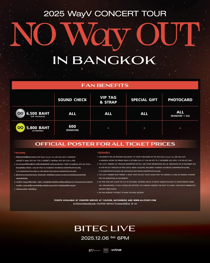 เปิดจำหน่ายบัตรแล้ววันนี้ ทางเคาน์เตอร์เซอร์วิสในร้าน 7-Eleven ทุกสาขาทั่วประเทศ และทางเว็บไซต์ www.allticket.com/event/WayV_NOWayOUT_BANGKOK พร้อมสิทธิพิเศษสำหรับผู้ซื้อบัตร