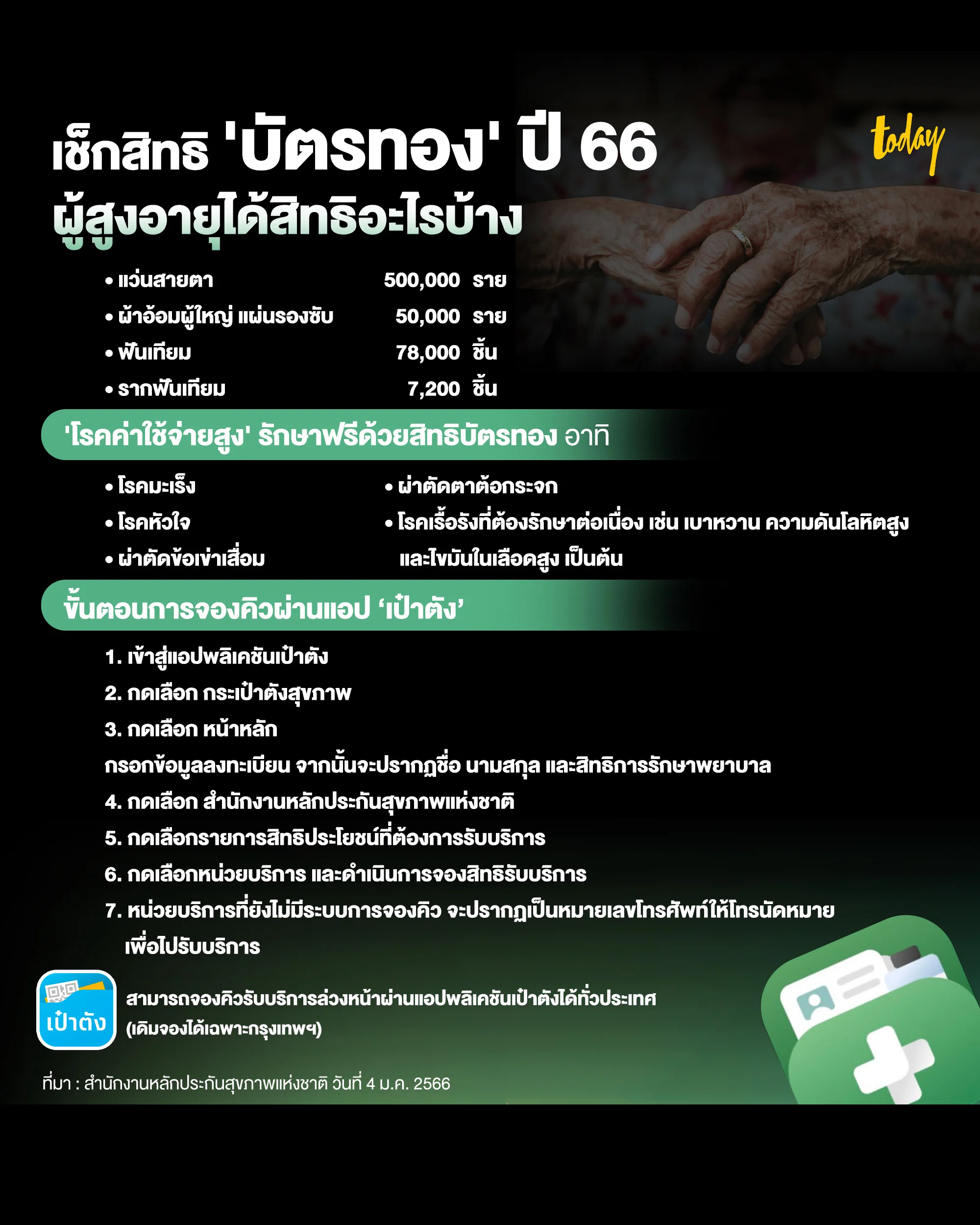 สปสช. จัดสิทธิประโยชน์เพื่อผู้สูงอายุ มอบแว่นสายตา ผ้าอ้อมผู้ใหญ่ และฟันเทียม-รากฟันเทียม ช่วยเพิ่มคุณภาพชีวิตที่ดี ‘ปีแห่งสุขภาพสูงวัยไทย’ พร้อมมอบของขวัญผู้มีสิทธิบัตรทองทุกกลุ่มวัย ขยายระบบจองคิวผ่านแอปเป๋าตังทั่วประเทศ