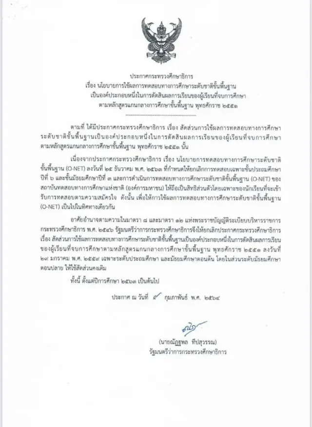 กระทรวงศึกษาธิการออกประกาศ ยกเลิกสัดส่วนการใช้ผลสอบ O-NET เฉพาะชั้นประถมศึกษาปีที่ 6 และชั้นมัธยมศึกษาปีที่ 3 และการดำเนินการทดสอบ O-NET ของสถาบันทดสอบทางการศึกษาแห่งชาติ (องค์การมหาชน) หรือ สทศ.ให้ถือเป็นสิทธิส่วนตัวโดยเฉพาะของนักเรียนที่จะเข้ารับการทดสอบตามความสมัครใจ