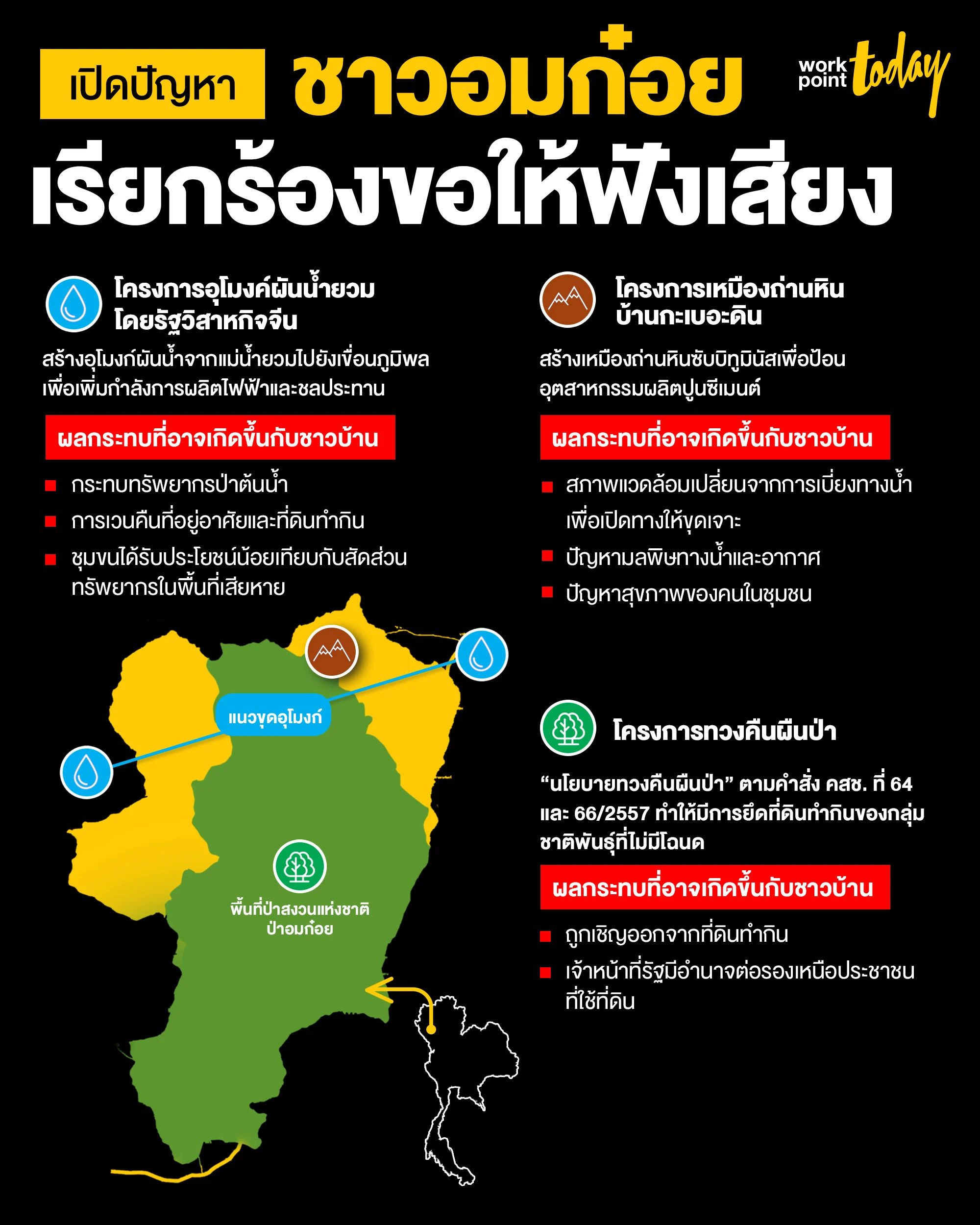 ปี 2557 คสช.ออก “นโยบายทวงคืนผืนป่า” ตามคำสั่ง คสช. ที่ 64 และ 66/2557 ทำให้เกิดการยึดที่ดินทำกินในหลายพื้นที่ พื้นที่อมก๋อยก็เป็นหนึ่งในนั้น ซึ่งผลกระทบที่ตามมาก็คือคนที่อยู่ในป่าที่ไม่มีโฉนด โดยเฉพาะกลุ่มชาติพันธ์ที่ทำไร่ อยู่กินด้วยเศรษฐกิจรากฐานไม่มีที่ดินทำกิน ส่งผลให้เศรษฐกิจของพวกเขาเปลี่ยนรูปแบบมาเป็นการหางานรับจ้าง ส่งผลกระทบถึงวัฒนธรรมวิถีชีวิตชาติพันธ์ุและเข้าสู่วงจรเศรษฐกิจแบบยากจน
