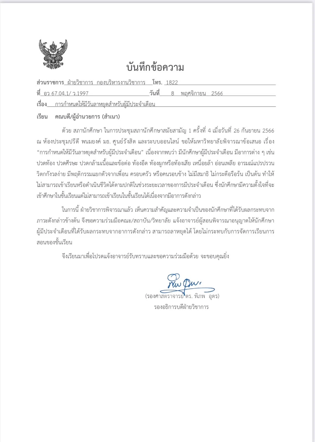 ในการนี้ ฝ่ายวิชาการพิจารณาแล้ว เห็นความสำคัญและความจำเป็นของนักศึกษาที่ได้รับผลกระทบจากภาวะดังกล่าวข้างต้น จึงขอความร่วมมือคณะ/สถาบัน/วิทยาลัย แจ้งอาจารย์ผู้สอนพิจารณาอนุญาตให้นักศึกษา ผู้มีประจำเดือนที่ได้รับผลกระทบจากอาการดังกล่าว สามารถลาหยุดได้ โดยไม่กระทบกับการจัดการเรียนการสอนของชั้นเรียน จึงเรียนมาเพื่อโปรดแจ้งอาจารย์รับทราบและขอความร่วมมือด้วย จะขอบคุณยิ่ง