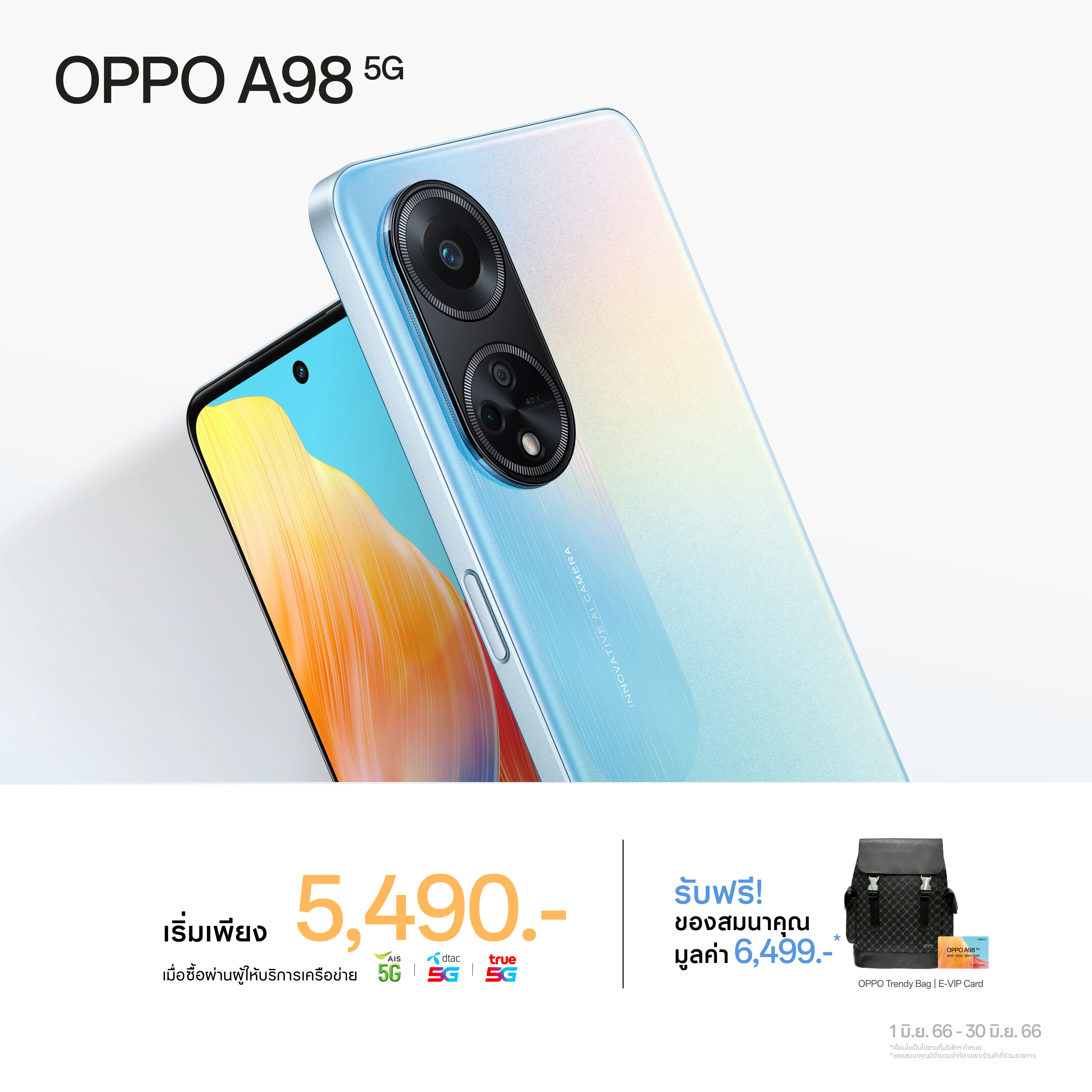 โดย OPPO A98 5G วางจำหน่ายในราคา 10,990 บาท พิเศษเมื่อสั่งซื้อทางผู้ให้บริการเครือข่าย AIS, dtac และ true ราคาเริ่มต้นเพียง 5,490 บาท พร้อมรับของแถมสุดพิเศษ E-VIP Card ประกันจอแตก และ OPPO Trendy Bag มูลค่ารวม 6,499 บาท ตั้งแต่วันที่ 1 – 30 มิถุนายน 2566 ที่ OPPO Brand Shop และตัวแทนจำหน่ายทั่วประเทศ