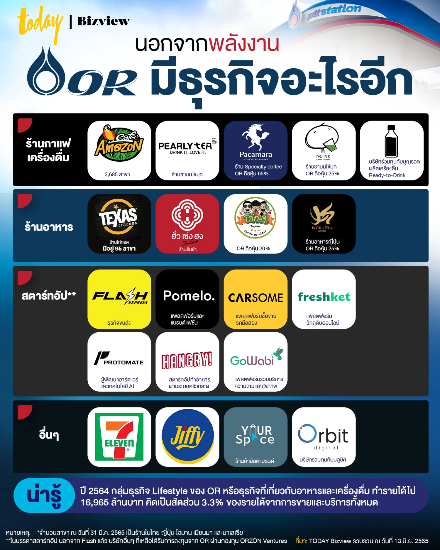OR หรือ บริษัท ปตท. น้ำมันและการค้าปลีก จำกัด (มหาชน) มีธุรกิจอื่นนอกจากพลังงาน และหนึ่งในขาธุรกิจสำคัญคือ ร้านค้าปลีกและอาหาร โดยลงทุนในหลายบริษัทที่ไม่เกี่ยวกับพลังงานไปหลายเจ้า