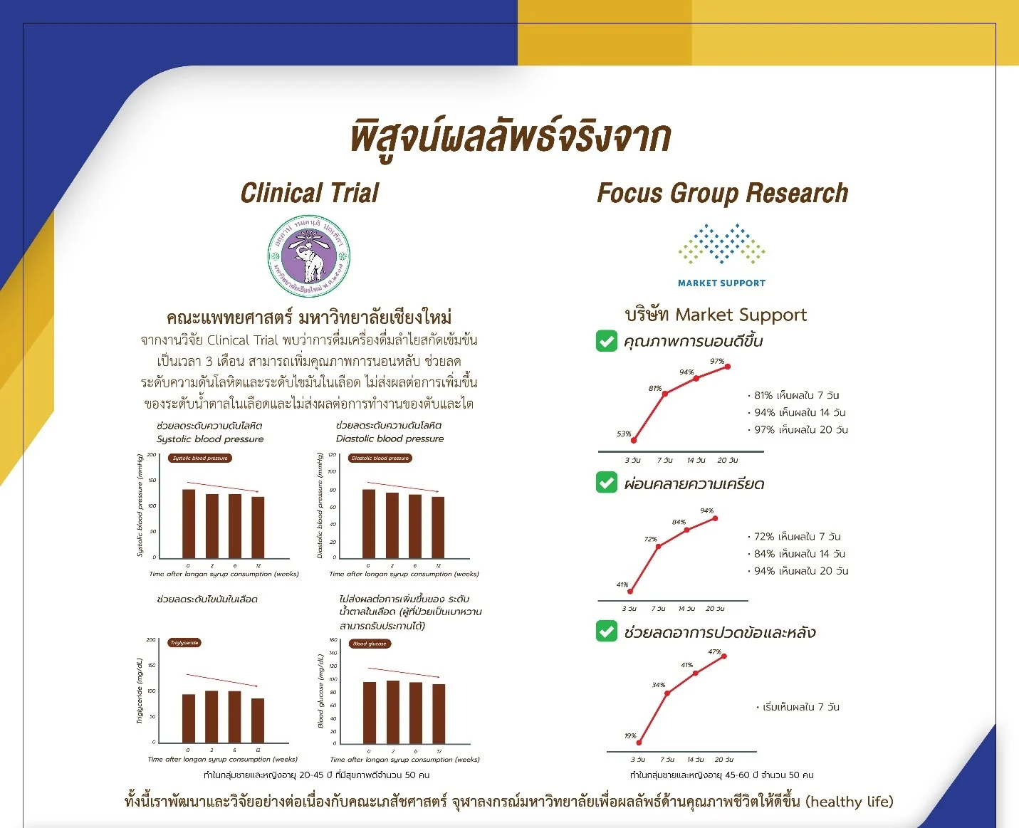เรื่องดังกล่าวได้รับการพิสูจน์ผลลัพธ์จริงจากงานวิจัย Clinical Trial คณะแพทยศาสตร์ มหาวิทยาลัยเชียงใหม่ ที่พบว่า การดื่มลำไยสกัดเข้มข้นเป็นเวลา 3 เดือน สามารถเพิ่มคุณภาพการนอนหลับ ช่วยลดระดับความดันโลหิตและระดับไขมันในเลือด ไม่ส่งผลต่อการเพิ่มขึ้นของระดับน้ำตาลในเลือด และไม่ส่งผลต่อการทำงานของตับและไต