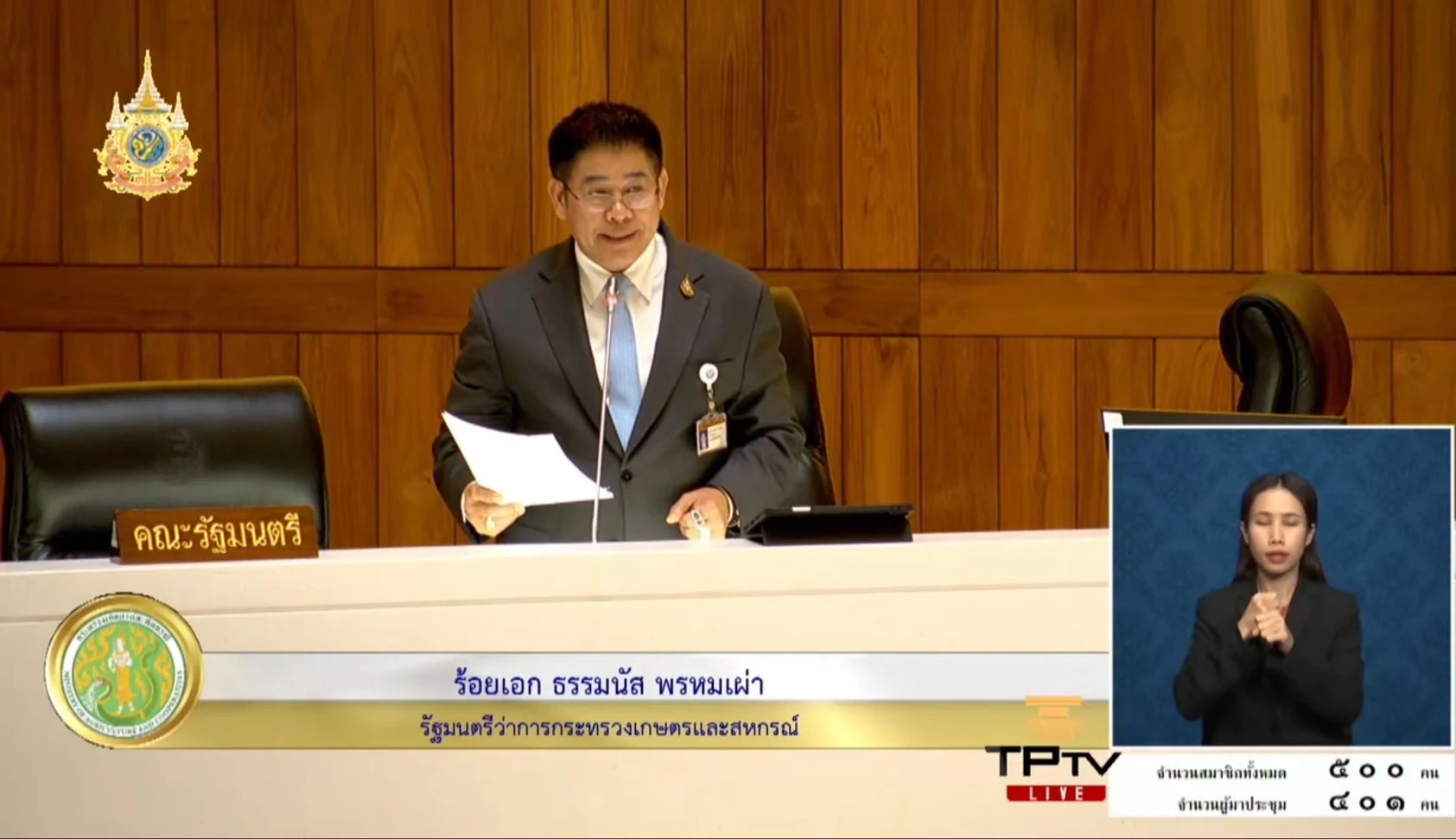 ด้าน ร.อ.ธรรมนัส พรหมเผ่า รมว.เกษตรและสหกรณ์ ตัวแทนคณะรัฐมนตรี (ครม.) ชี้่แจงว่า อยากให้หลับตาและนึกถึงพี่น้องชาวประมงทั้ง 22 จังหวัดว่า 10 ปีที่ผ่านมา นึกสภาพสมัยก่อนที่ไม่มีกฎหมายมาบังคับ ประมงไทยถือเป็นเจ้าสมุทร ทำรายได้มหาศาล แต่ช่วงระยะเวลาที่ผ่านมา อุปสรรคกฎหมายมาบังคับไม่ให้ชาวประมงอยู่รอดได้ มีหนี้สินและคดีความติดตัว ยืนยันว่ากฎหมายที่รัฐบาลร่างมาในวันนี้ เป็นตัวแทนของพี่น้องชาวประมง ตนในฐานะ ครม. ขอให้เพื่อนสมาชิกมาร่วมทำบุญกัน ทำบุญให้กับพี่น้องคนไทย โดยเฉพาะครอบครัวชาวประมงทั้ง 22 จังหวัด